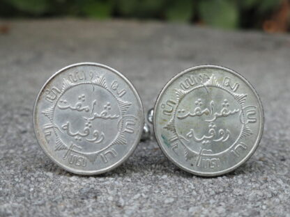This is a pair of cufflinks from coins of the Dutch East Indies. The side that faces outward has Indonesian words written in the Arabic script. The year is 1941, about the time that the Japanese took over the colonial possessions during WWII. So… these coins have definitely seen a lot of history. And of course, they are sterling silver. Can’t beat that, my friend.