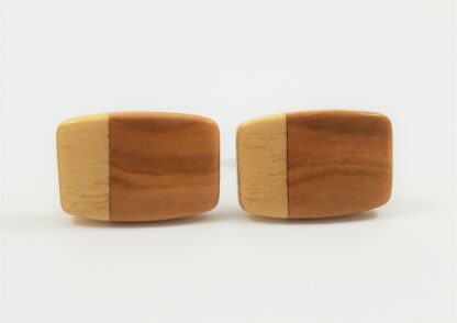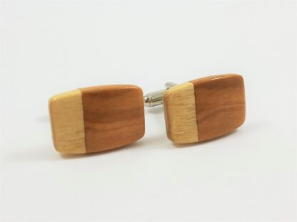 These cufflinks are made of highly polished wood. The grain and features are captured very well. Bethlehem olive is a beautifully grained wood. Paired with acacia, these two stunning woods are in perfect harmony. This lumber is made from the annual prunings of the olive groves around Bethlehem. The concept is that these are the woods used in the ancient Ark of the Covenant. I love wearing these ones because they look great without being over the top or gaudy.