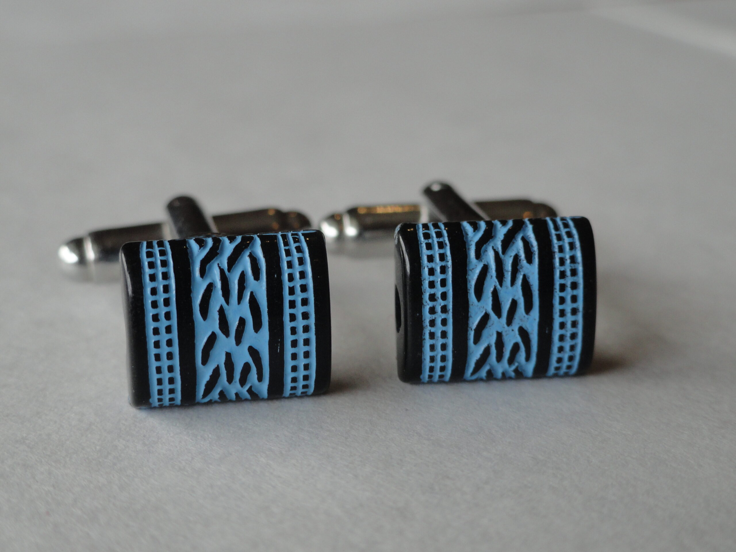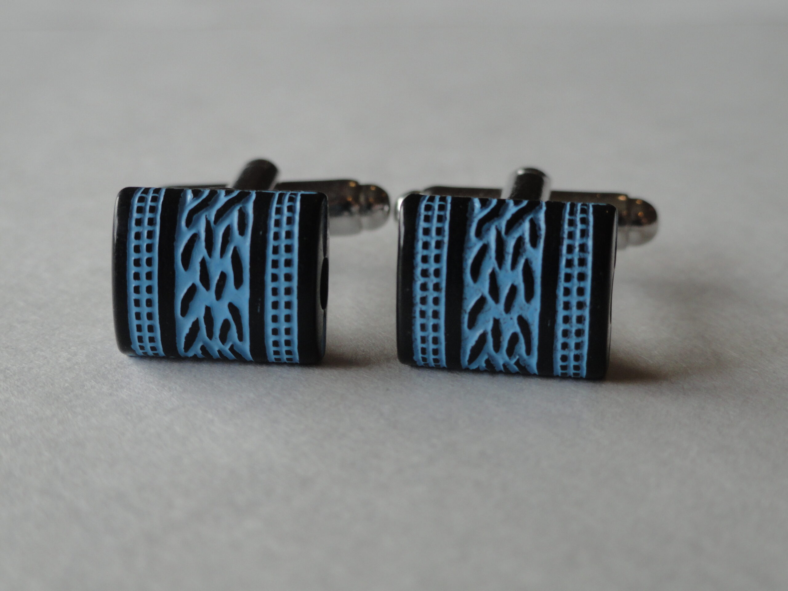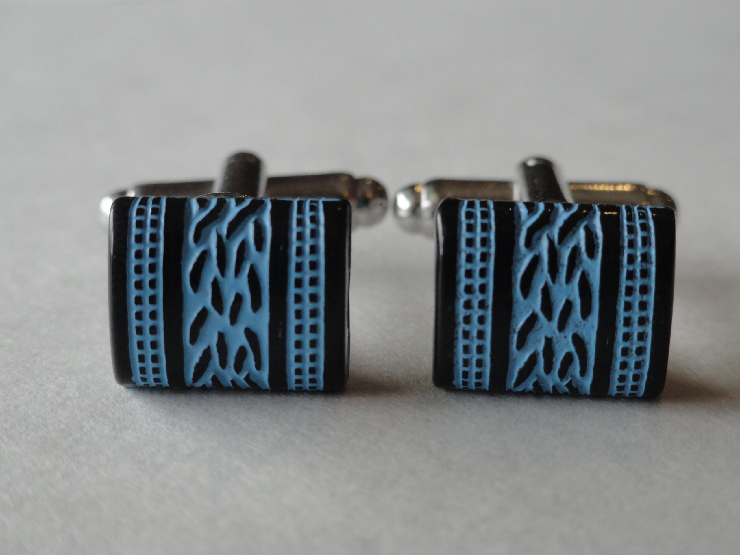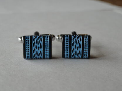 Here we have a nice little pair that would be perfect for almost any formal setting like banquets, balls, weddings, graduation, etc. They are about a centimeter wide. The color is a slightly darker sky blue with black. They have symmetrical sections of stripes, square dots and in the middle are little hash marks that remind me of abstracted wheat or footprints in the snow. They’re overall a rectangular shape. Classy without being gaudy or over the top.