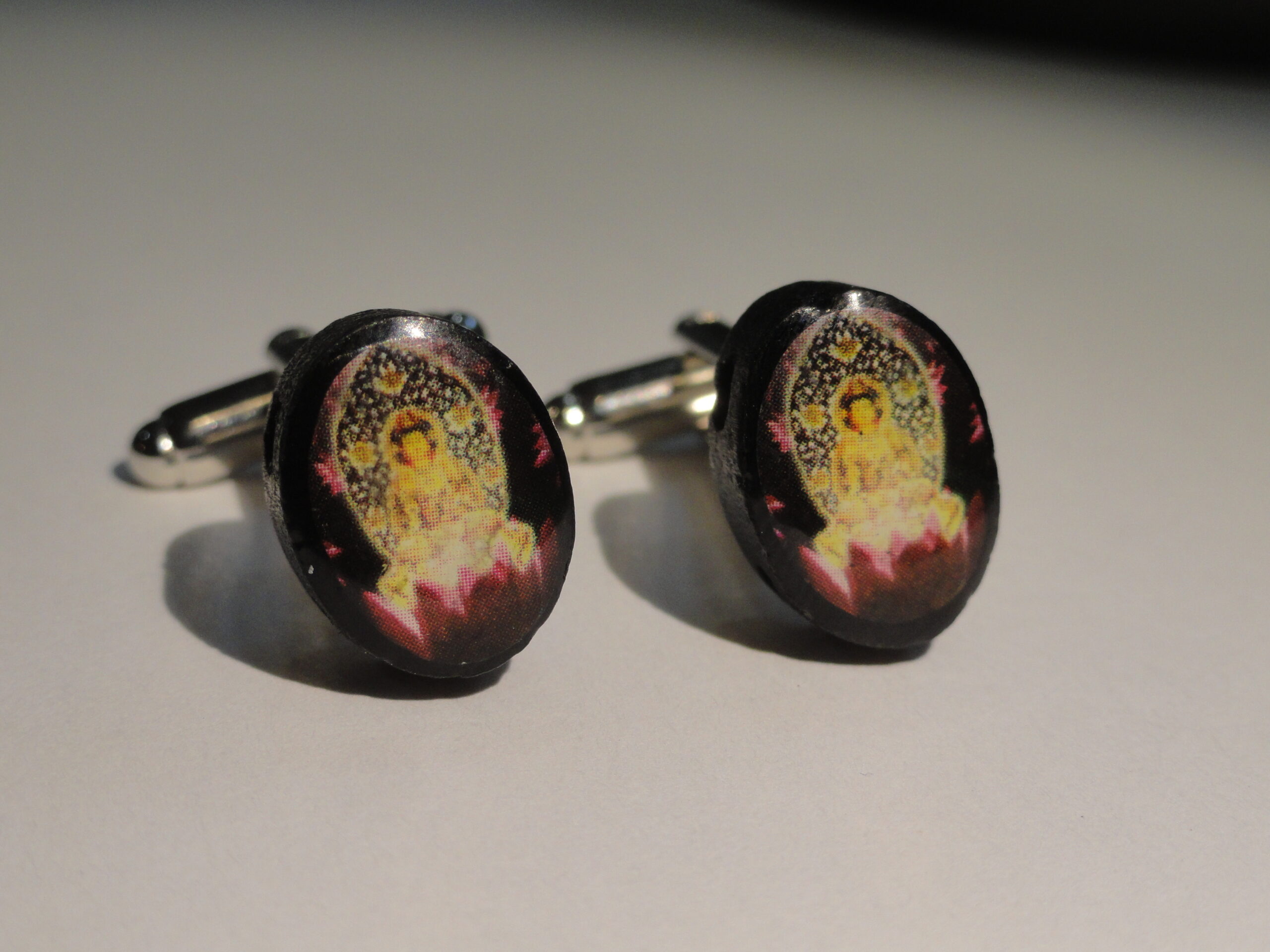 Here are a pair of cufflinks featuring Buddha, in a mainly Southeast Asian style. He sits upon a throne which is traditionally made of white lotus flowers. He wears the simple, saffron robe of a monk. His skin is white and he casts an aura around his head. He sits in a tranquil, asana yoga pose. Around him are flowers and decorative designs.