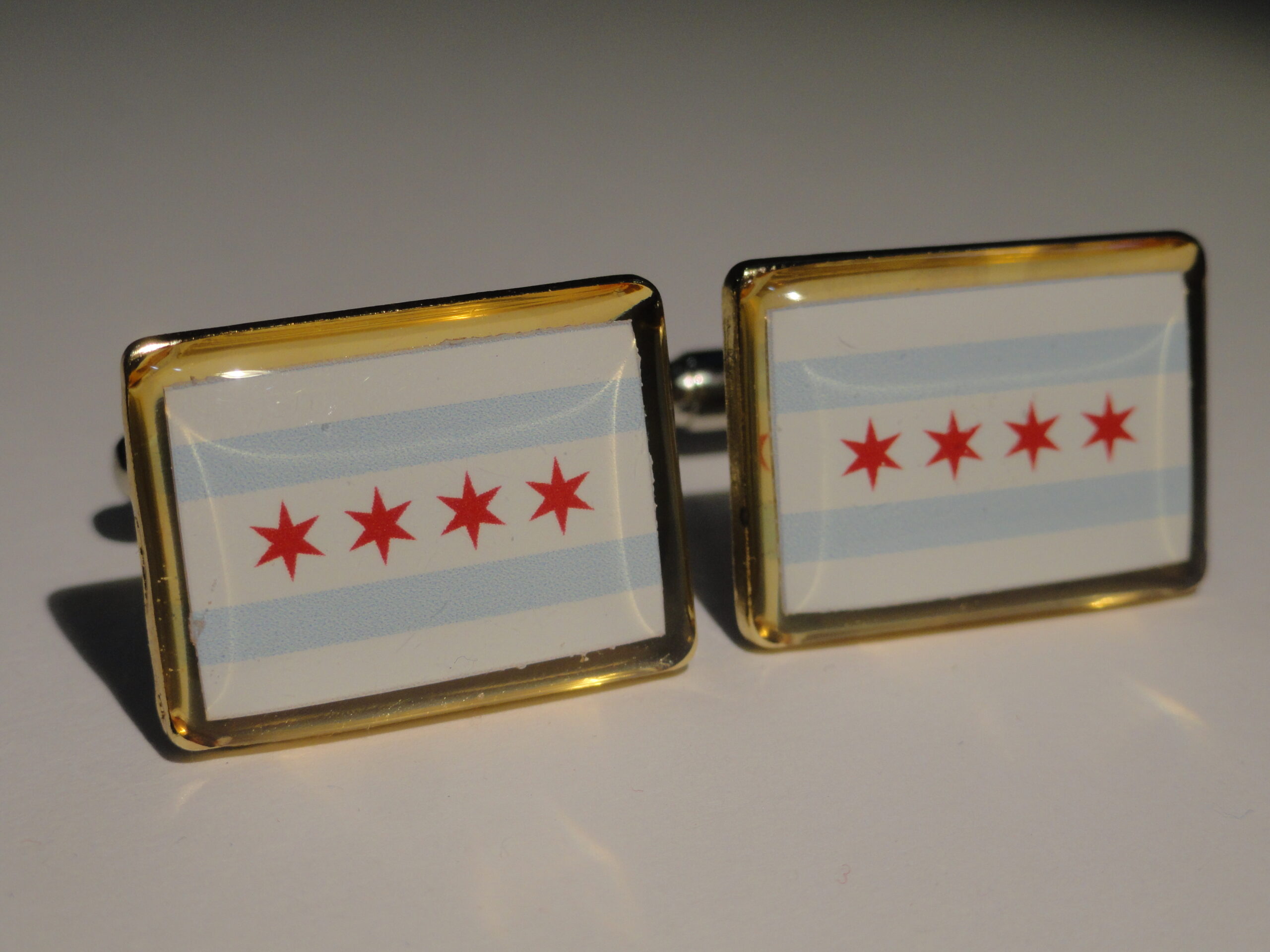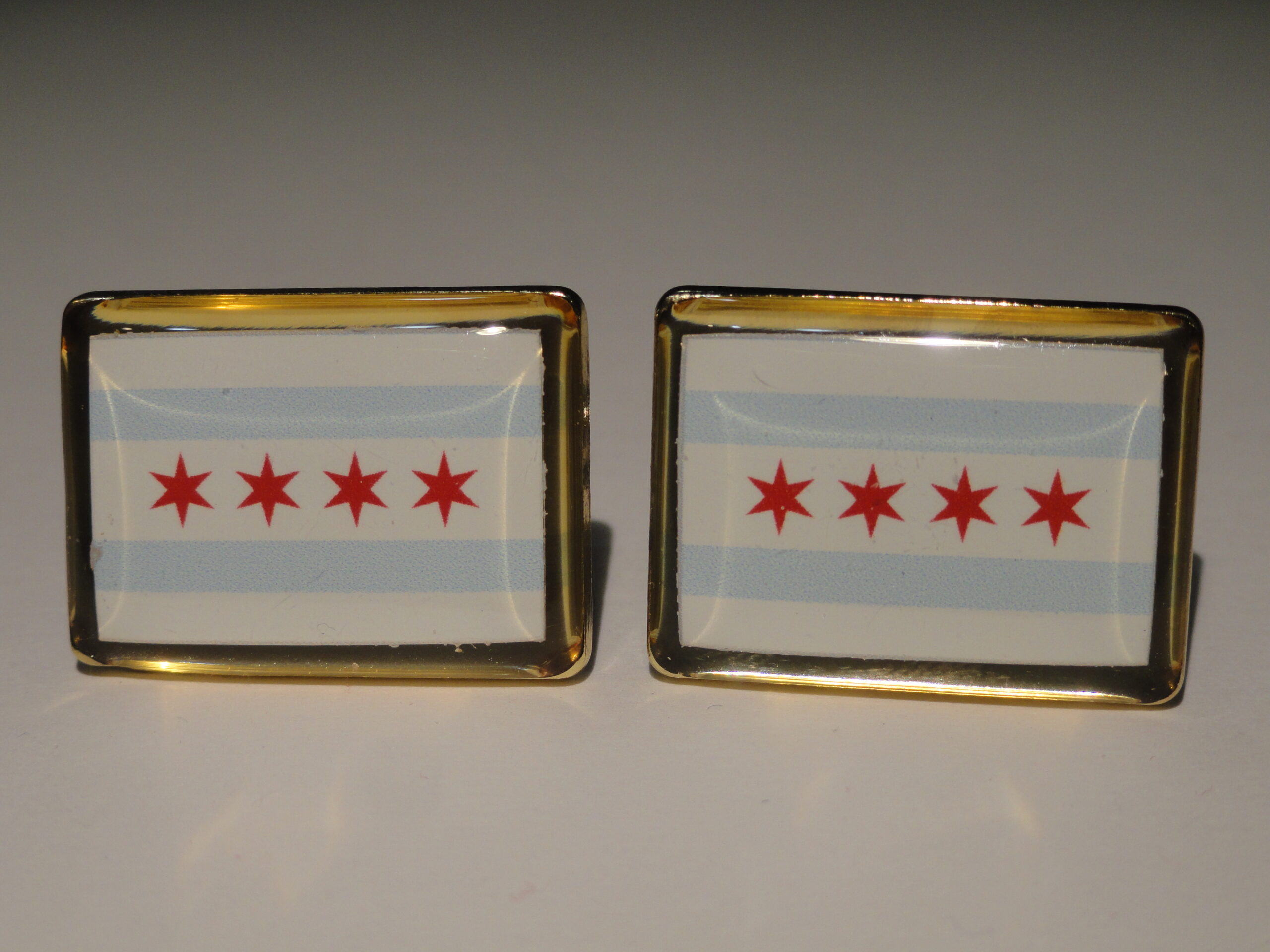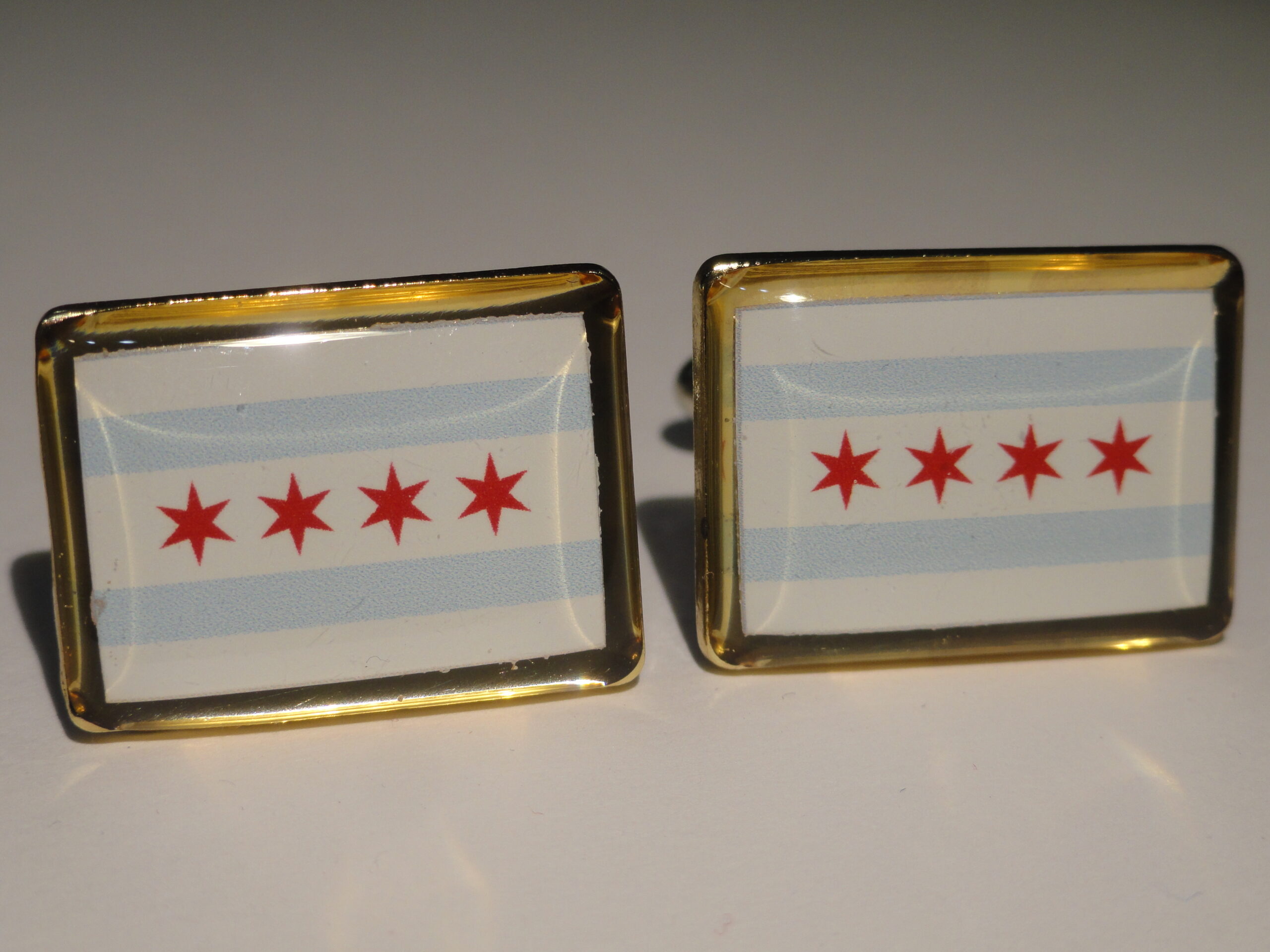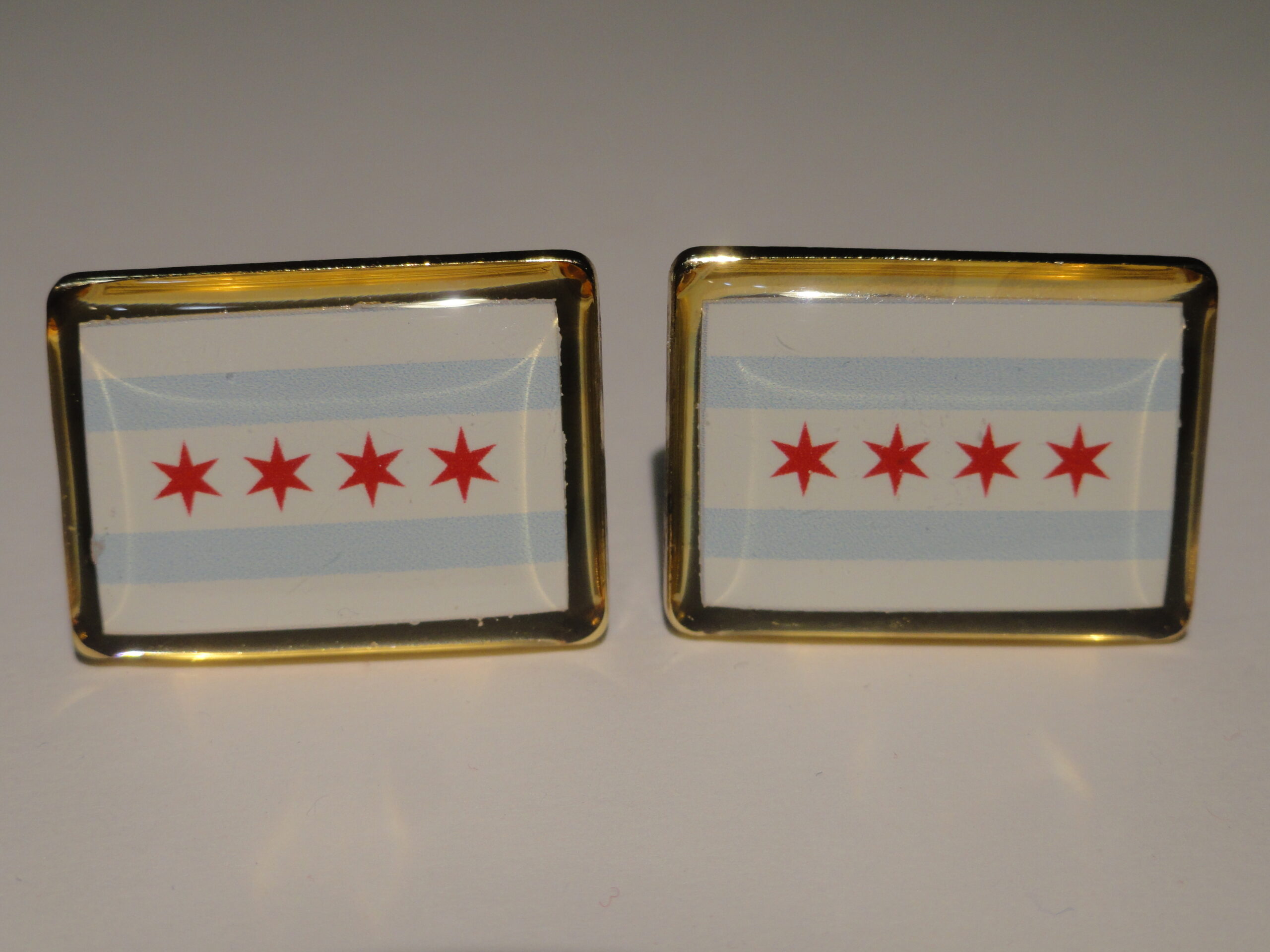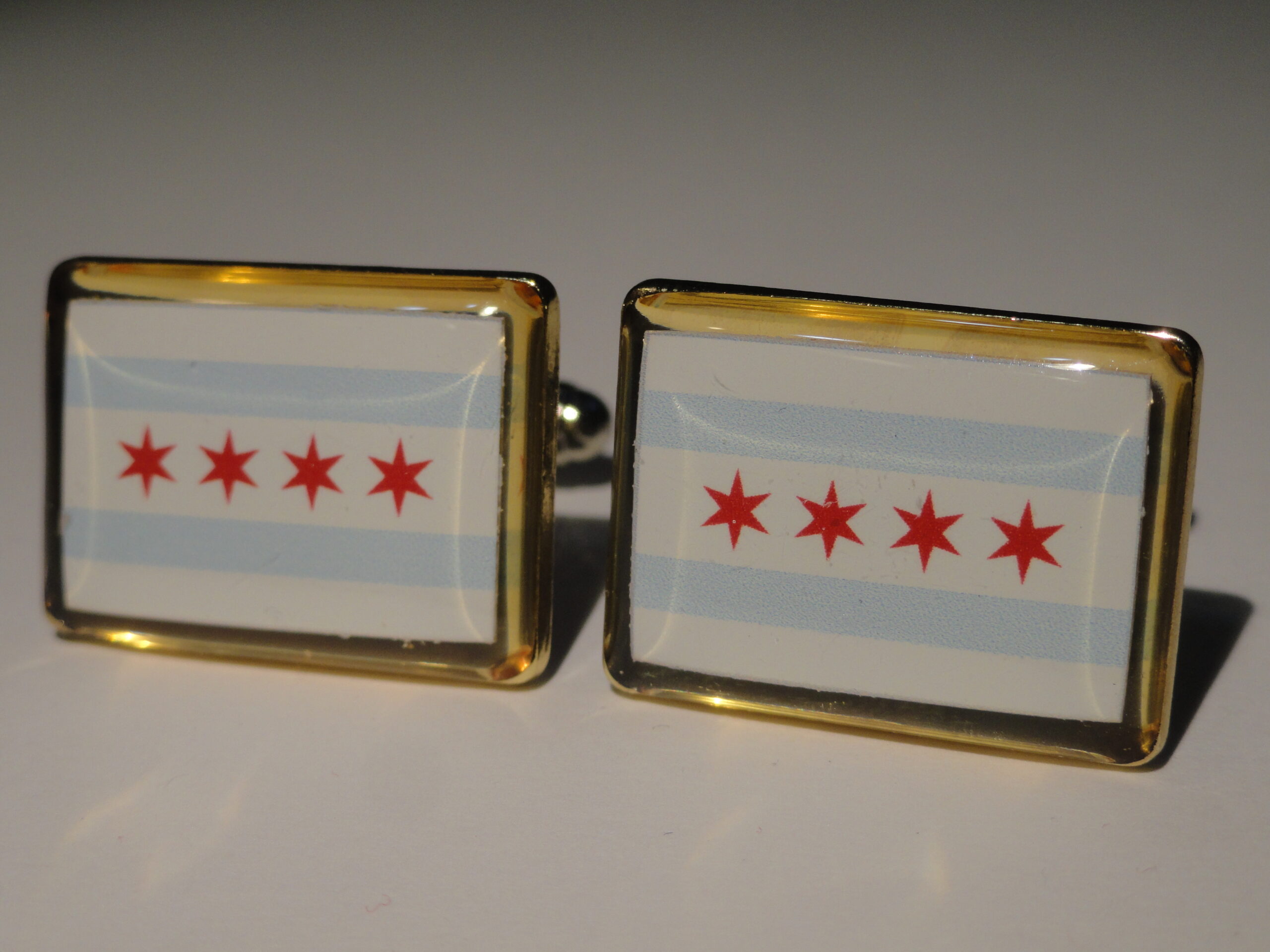 Hey guys these are cufflinks made from the flag of Chicago. Aren’t they gorgeous? Perfect for any man who is from Chicago, or just simply loves the city. Show your pride in your city by flaunting these bad boys. Also enjoy the low price!