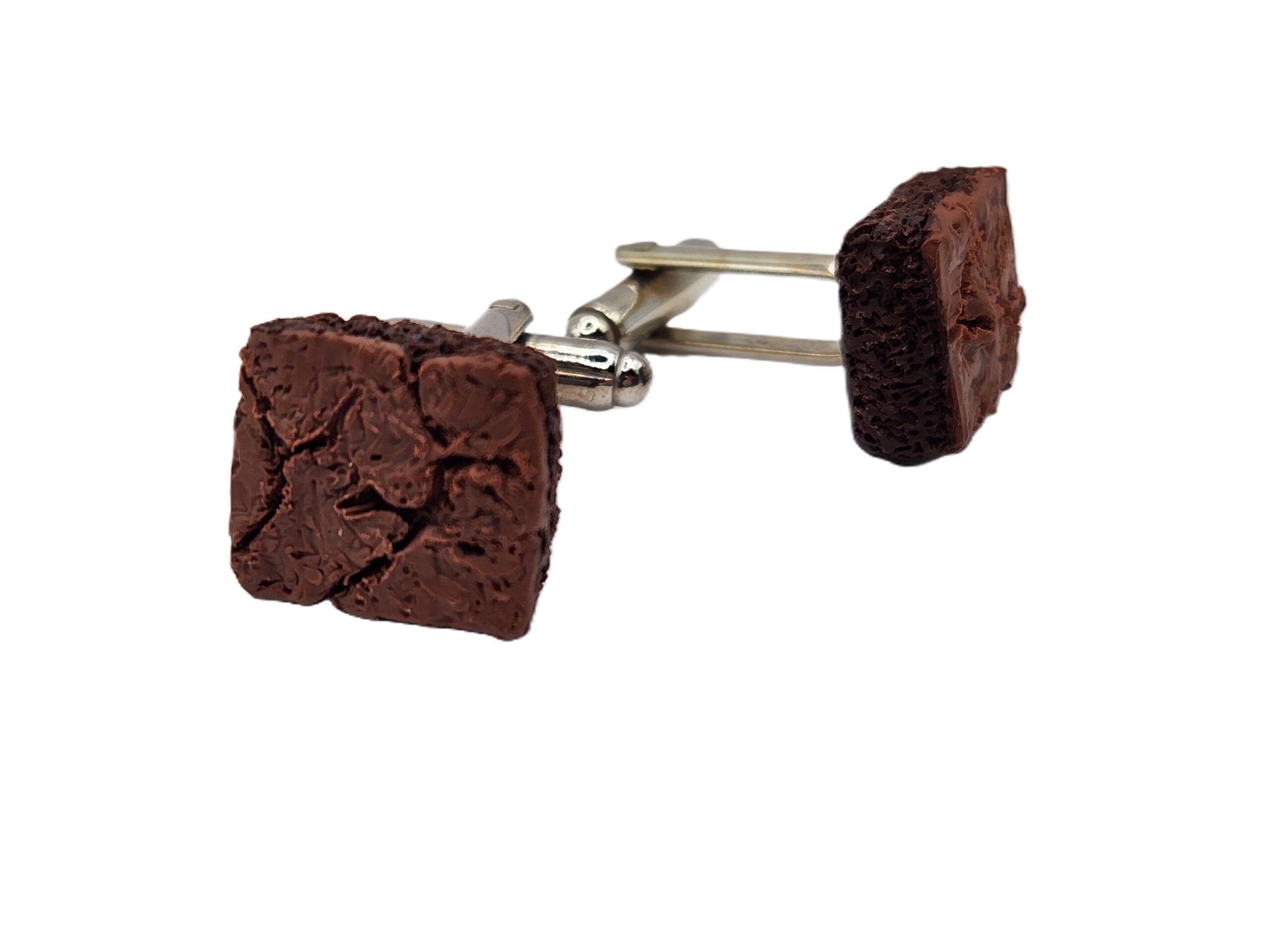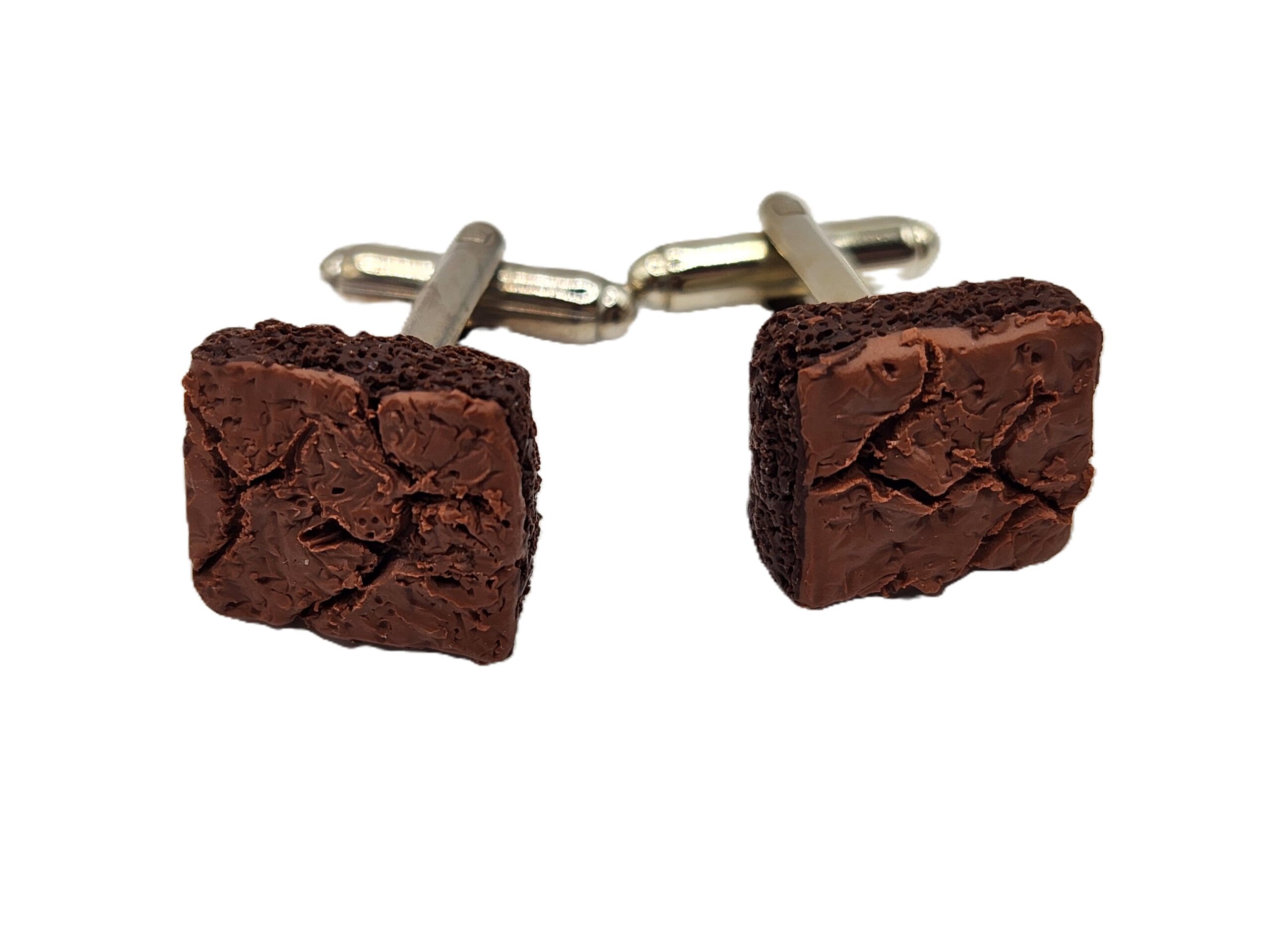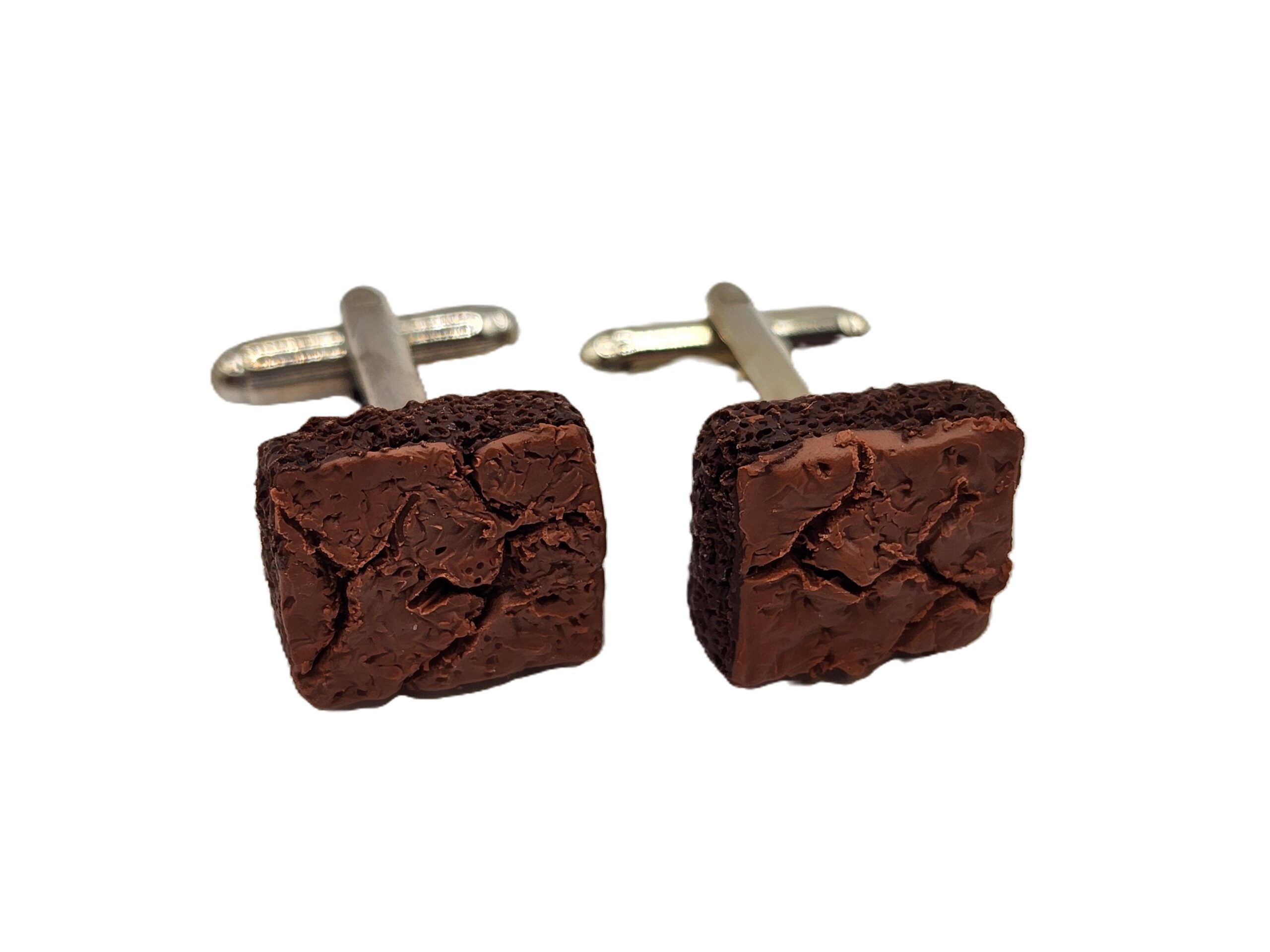 Wow! Don’t you just love these? A great pair for you or for some guy that loves brownies (which is… every man that I know of). Feature two little fudge brownies or slices of cake. The bottom portion depicts the sponge cake or brownie base with its crumbable and airy texture, though these are made out of ceramic and so will not crumb on you. The top is shows the traditional cracked texture of a brownie but also looks like frosting if you prefer to think of them as cake slices.