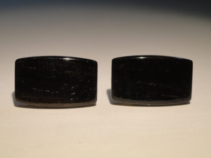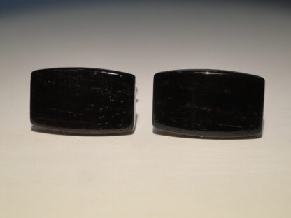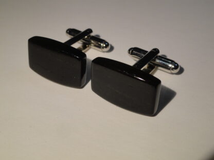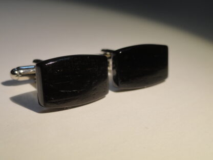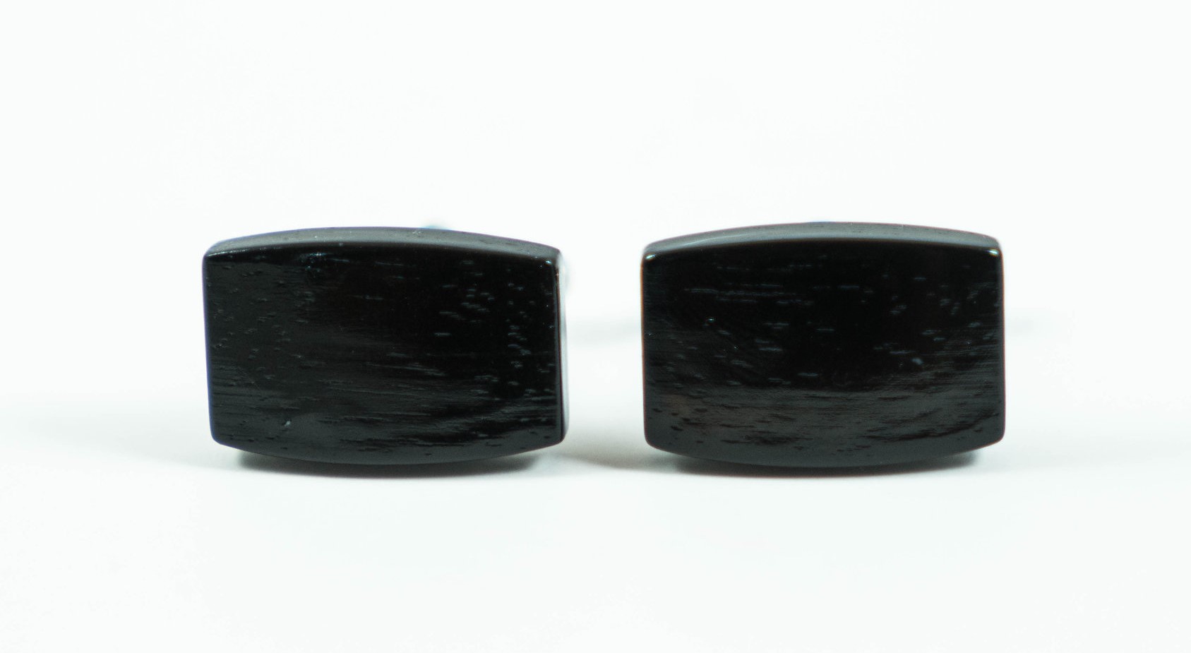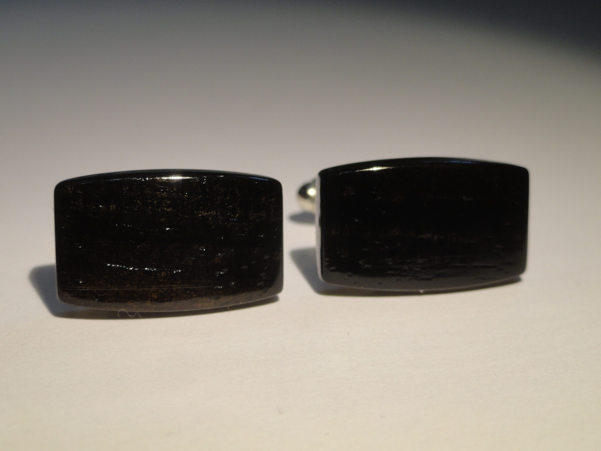 These cufflinks are made of highly polished wood from the ebony from the genus Diospyros of Africa. Ebony is dense enough to sink in water. The grain and features are captured very well, despite the overwhelming blackness of the wood. Ebony is a beautifully fine-grained exotic hardwood. All of this marbling, grain and striations that you see are 100% natural. The wood naturally grows like this: totally black. I have used no stains. This is the real color: a dense and gravitational black. I love wearing these ones because they look great without being over the top or gaudy.