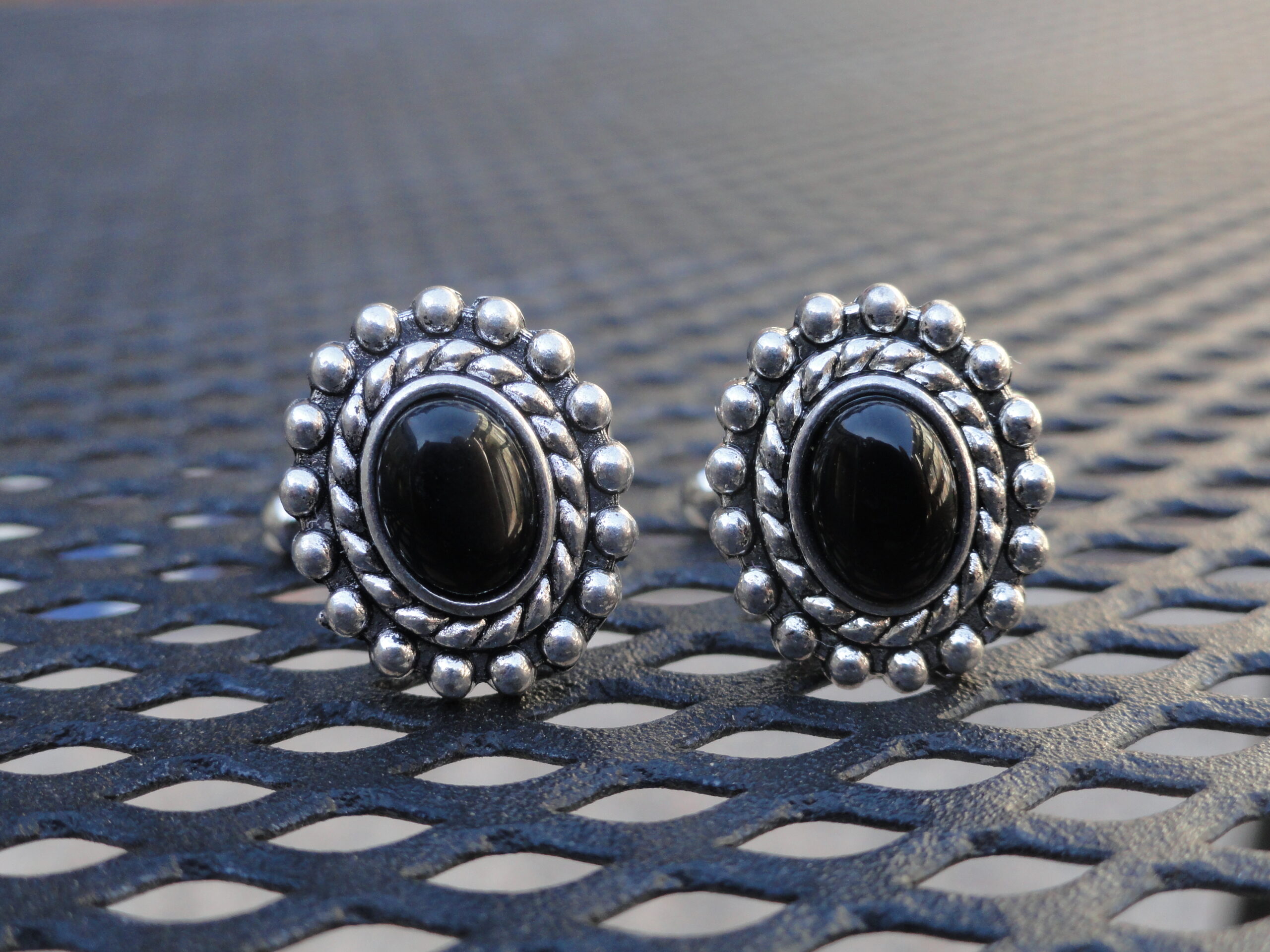 Small, elliptical pieces of brilliant black glass surrounded by a silver, beaded border. These are really nice. I love them. They are elegant without being gaudy.