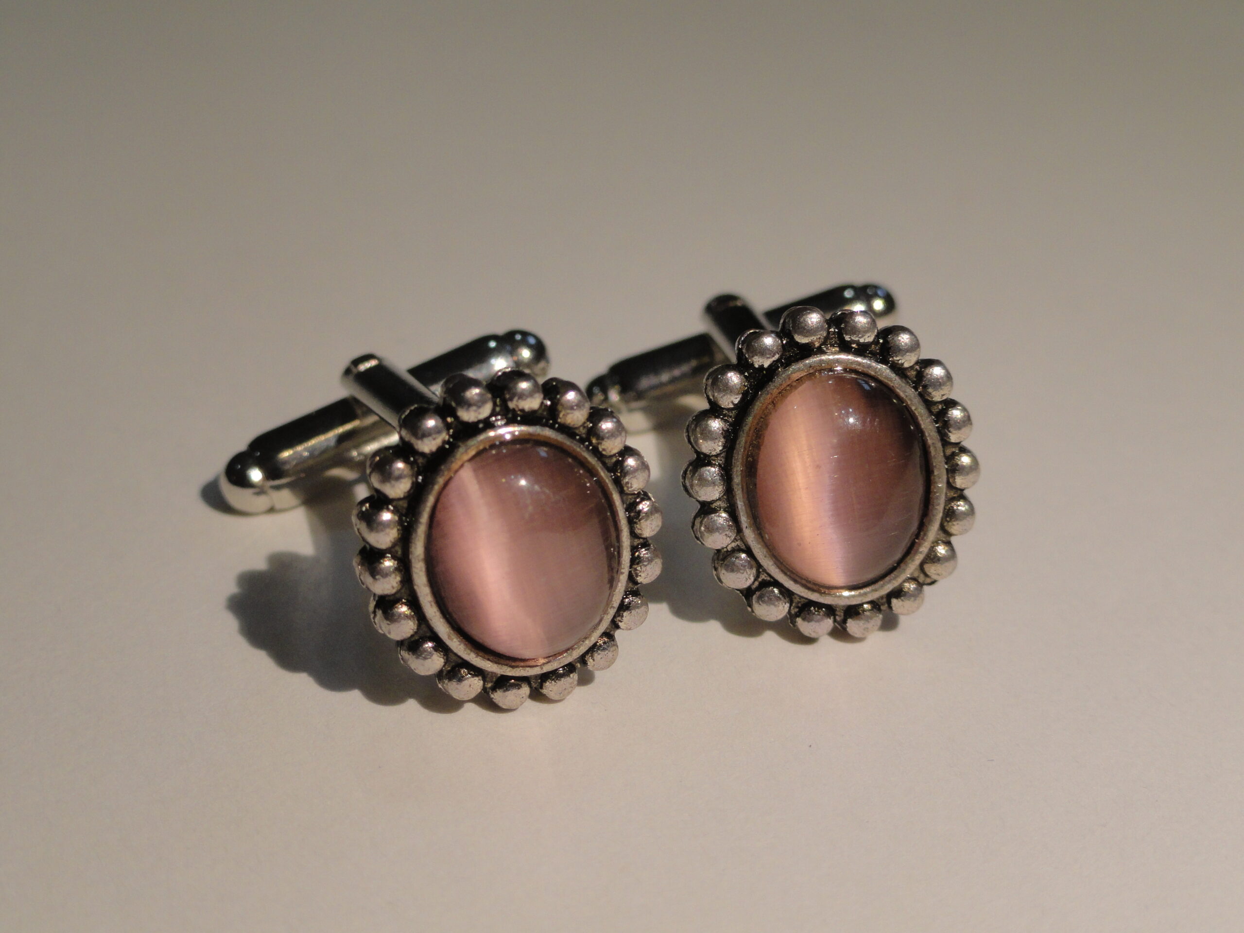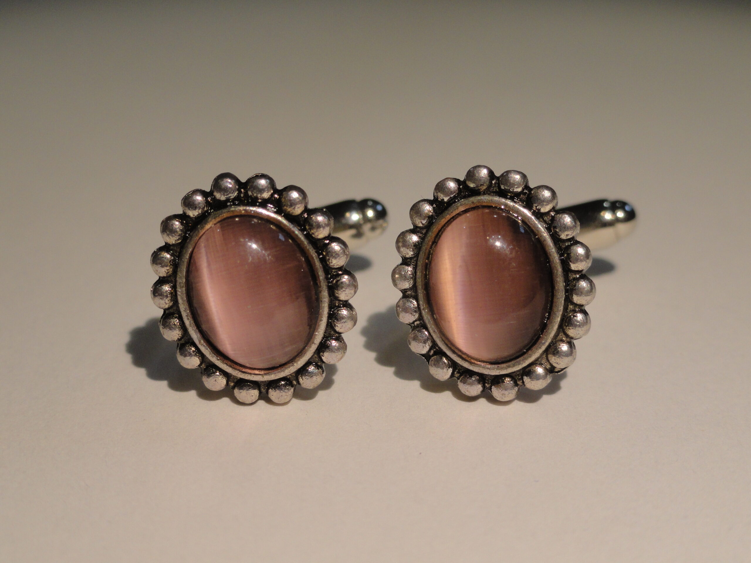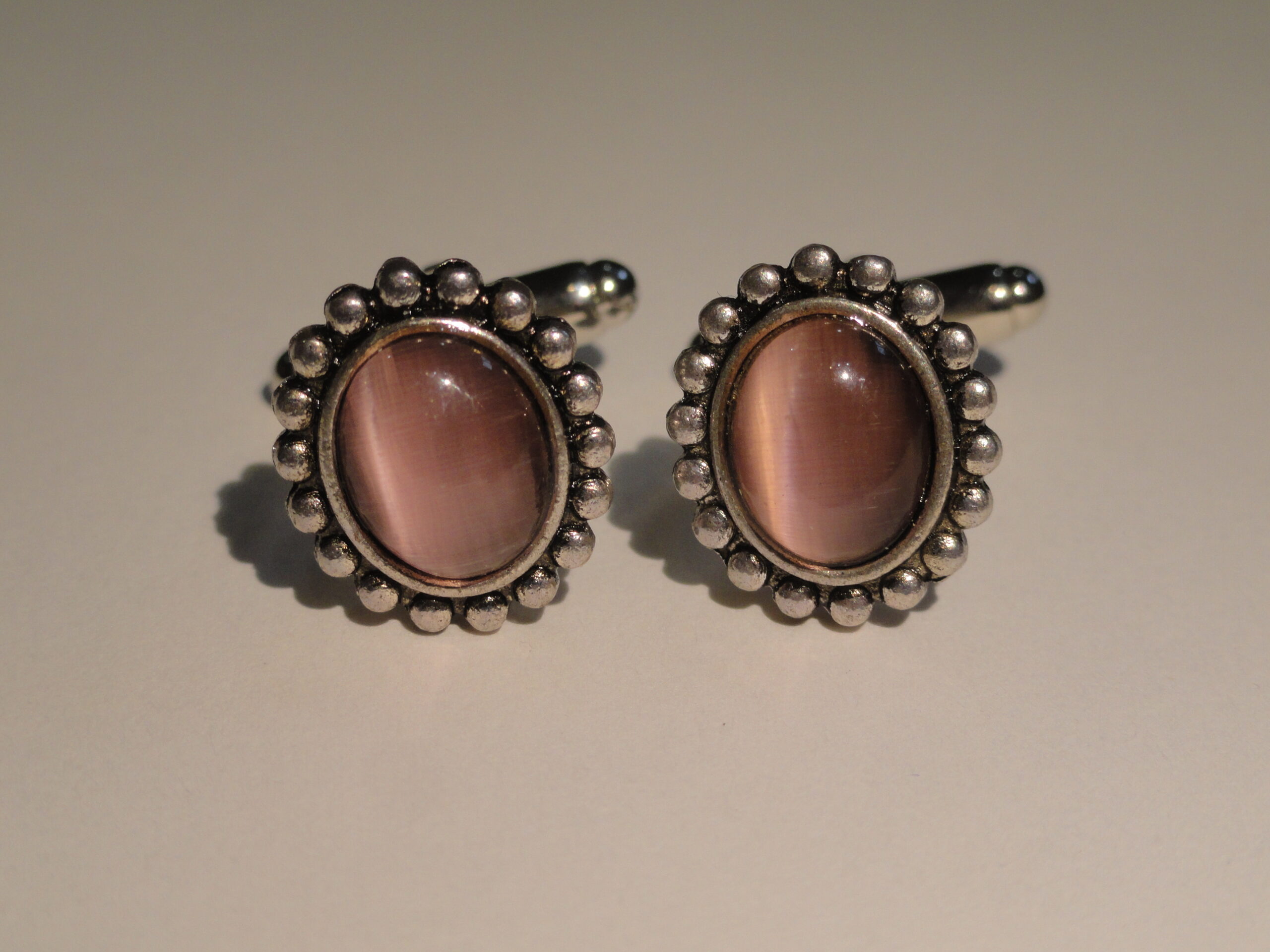 Small, elliptical pieces of brilliant rose pink glass surrounded by a silver, beaded border. These are really nice. I love them. They are elegant without being gaudy. The color is vibrant and iridescent.