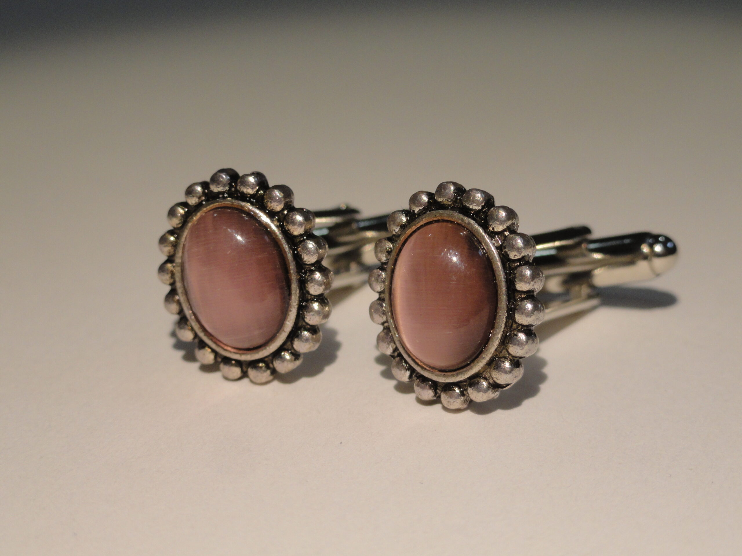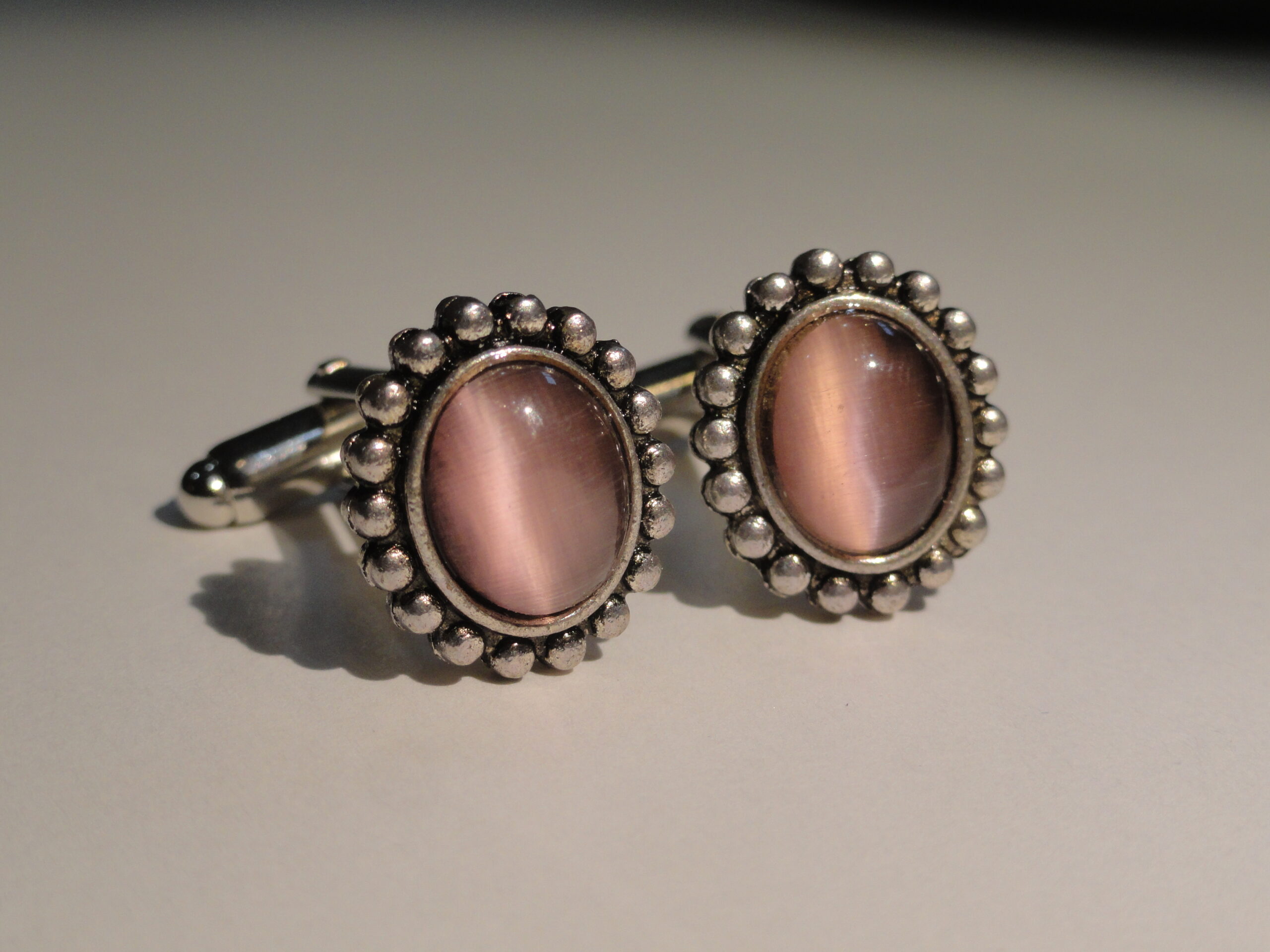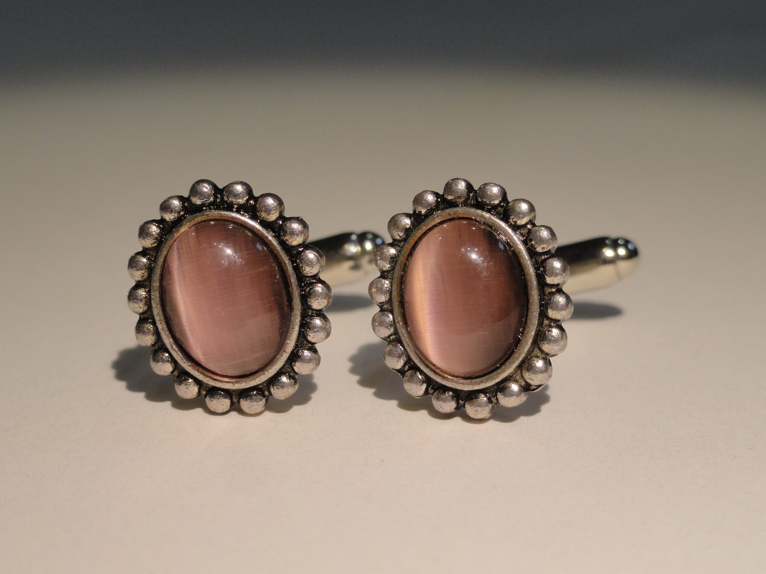 Small, elliptical pieces of brilliant rose pink glass surrounded by a silver, beaded border. These are really nice. I love them. They are elegant without being gaudy. The color is vibrant and iridescent.