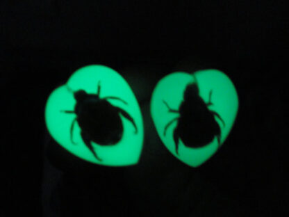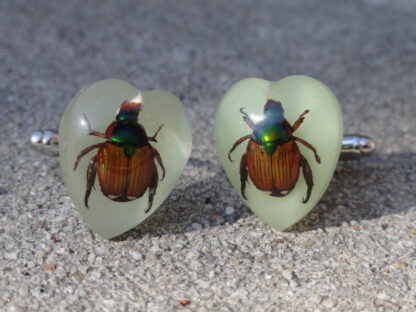 OMFG SWEET. These are made out of glow-in-the-dark plastic with real Japanese beetles inside them. Um… by FAR the manliest cufflinks on Etsy… perhaps in the world. You need these in your life. The beetles are well-matched for size and the plastic is very sturdy and glossy.
