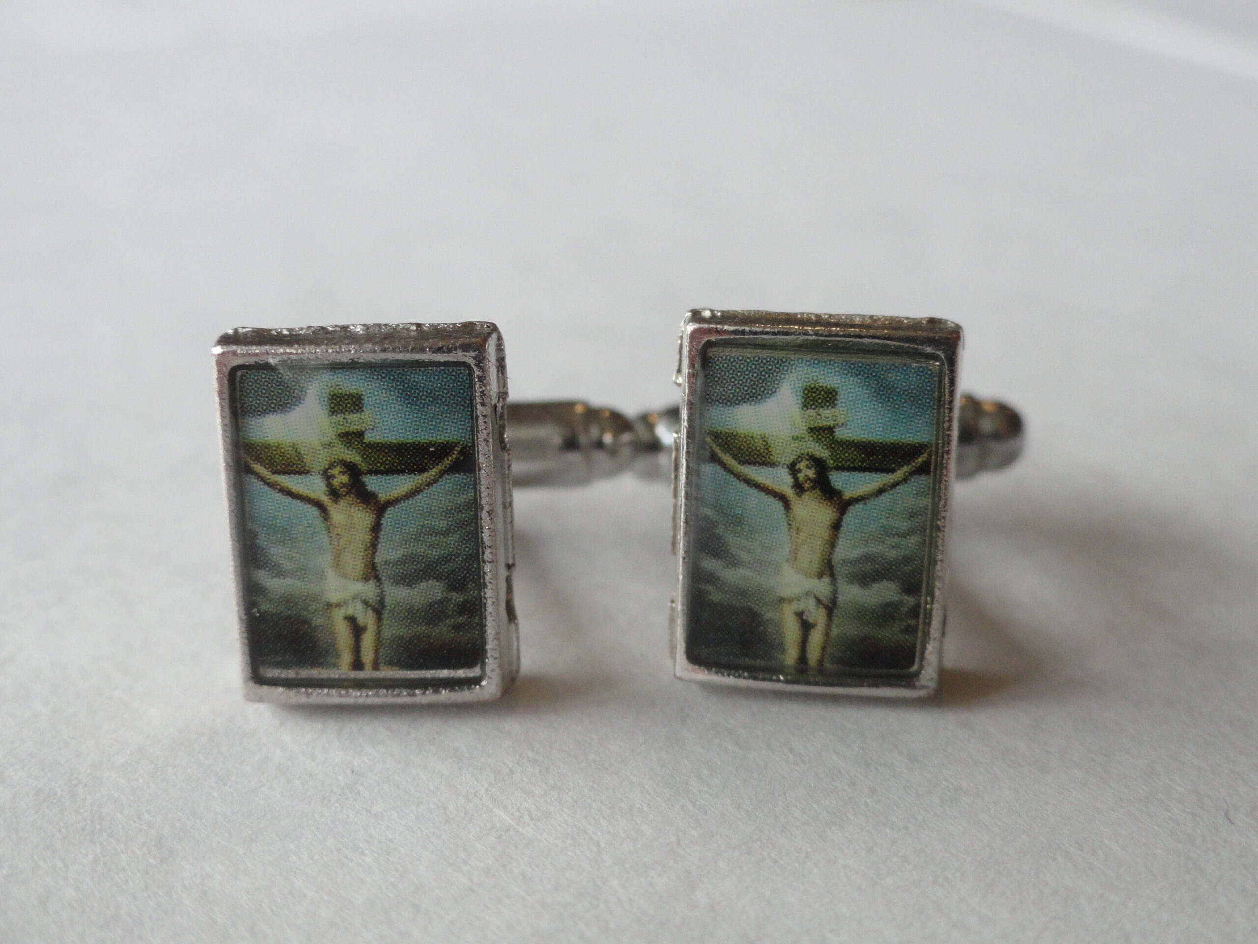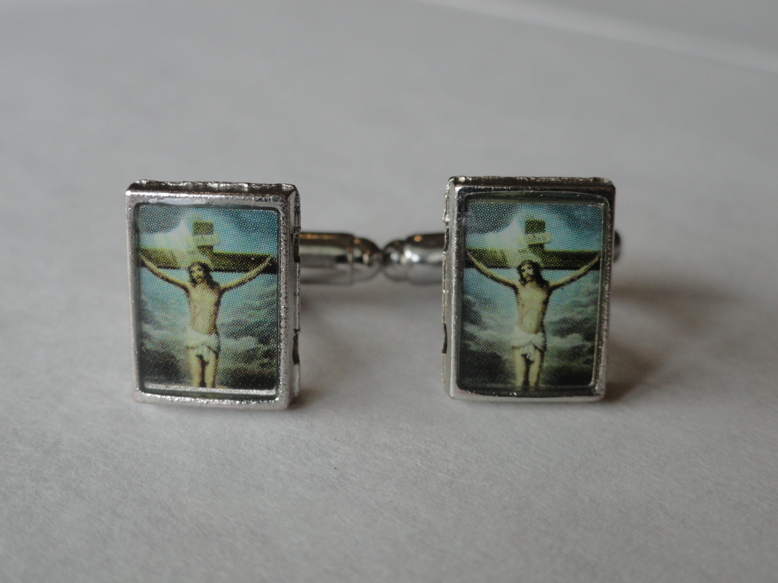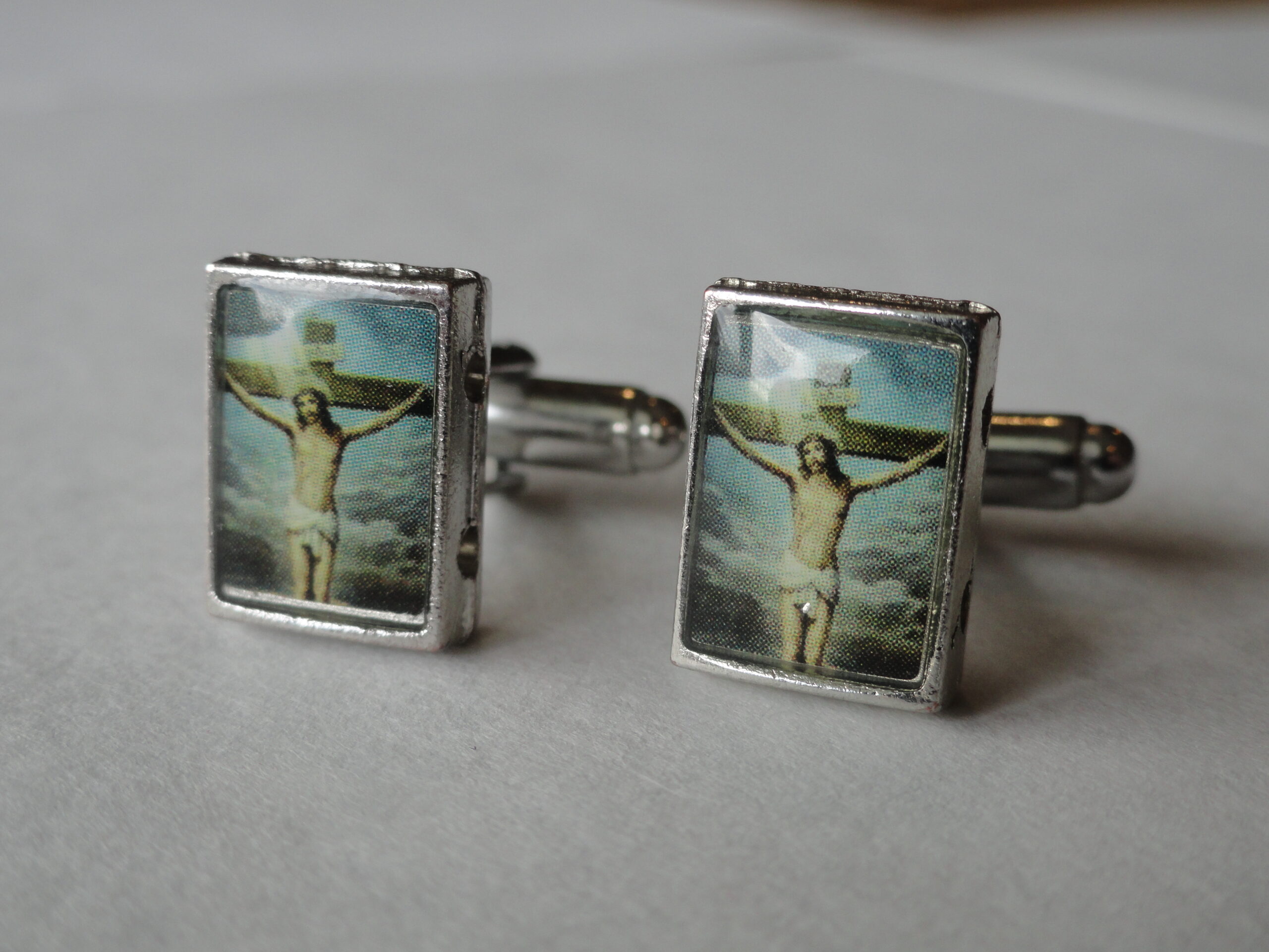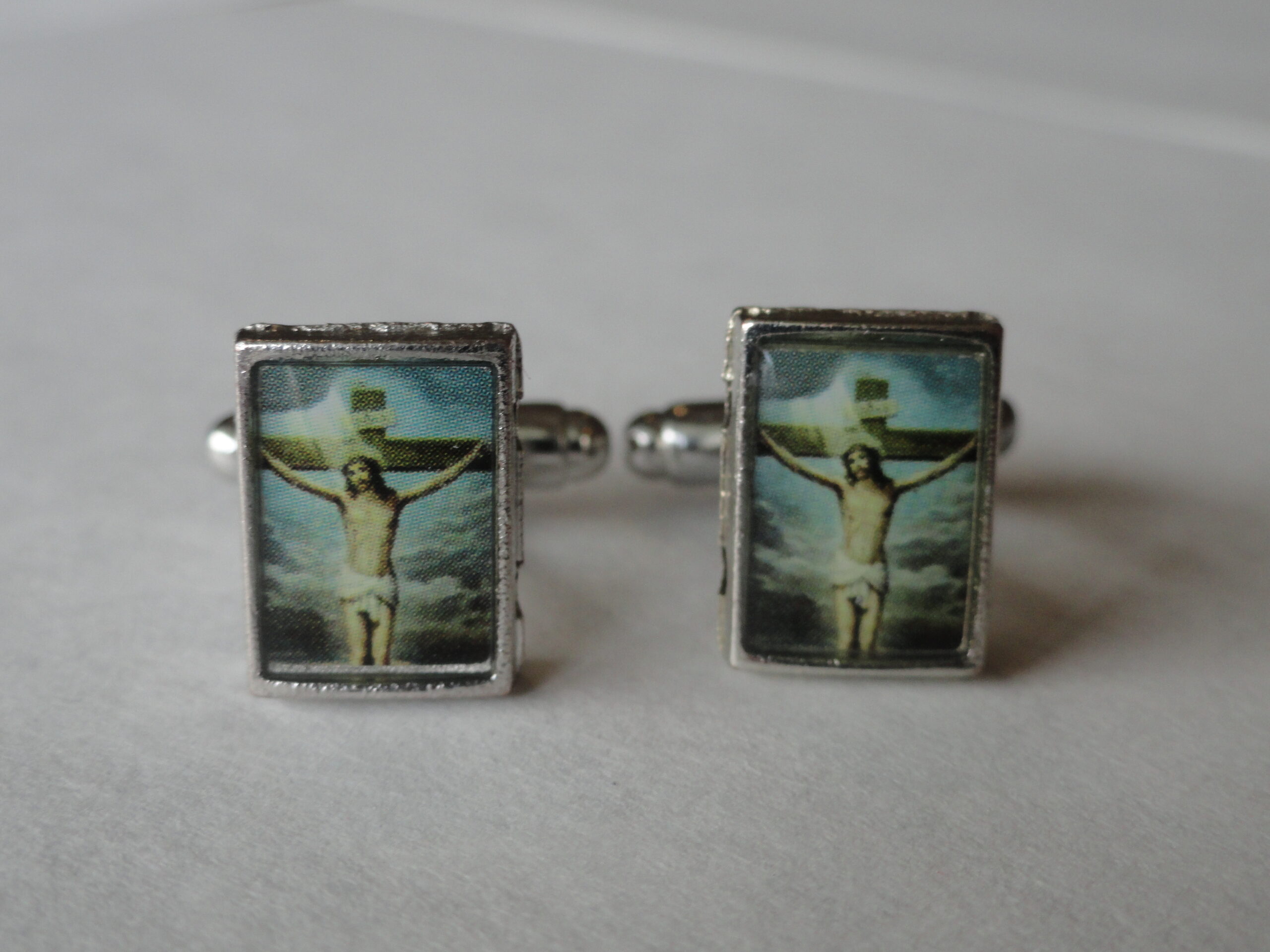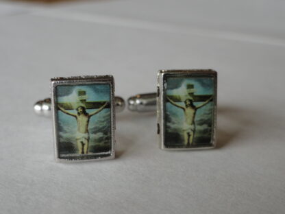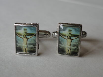 Here we have an addition to my new line of religious-themed cufflinks. This particular pair will appeal to many Christian people, particularly those of the Catholic and Protestant faiths, but also to many other Orthodox and Evangelical members as well. Great for anyone who might just be a fan of Western, Christian or Catholic art and iconography. Made to represent a Catholic painting of Jesus in a cathedral.