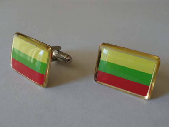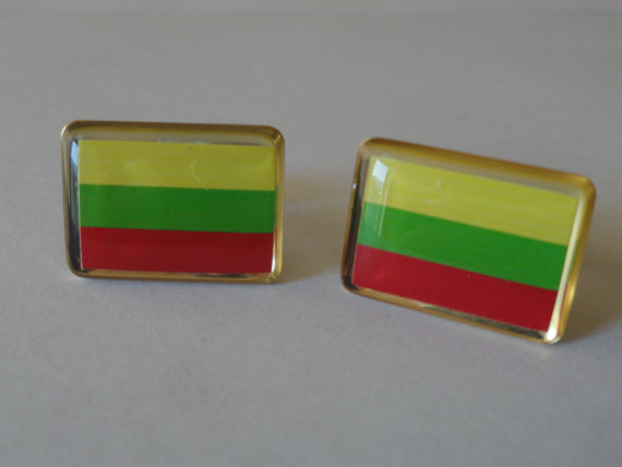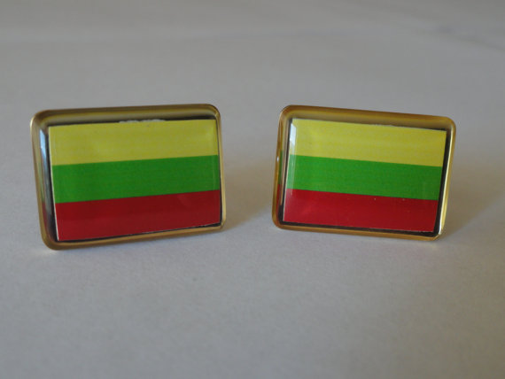 The flag of Lithuania turned into a brand new and unique pair of cufflinks. Perfect for people from Lithuania, Lithuanian heritage, have served as missionaries or worked in Lithuania, or who have visited and fallen in love with it. As someone who has personally lived in Lithuania, I can tell you I will be wearing the pair I make myself with pride. Features the three colors of the flag in outstanding quality with a glossy finish, yellow, red and green. The rims are gold. This pair really is beautiful and would work well in formal settings.