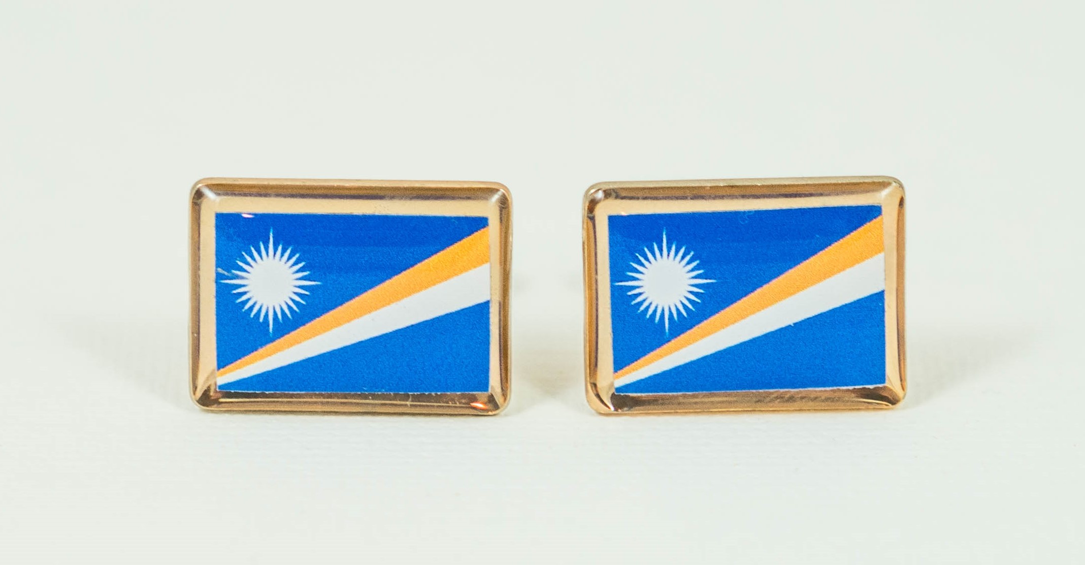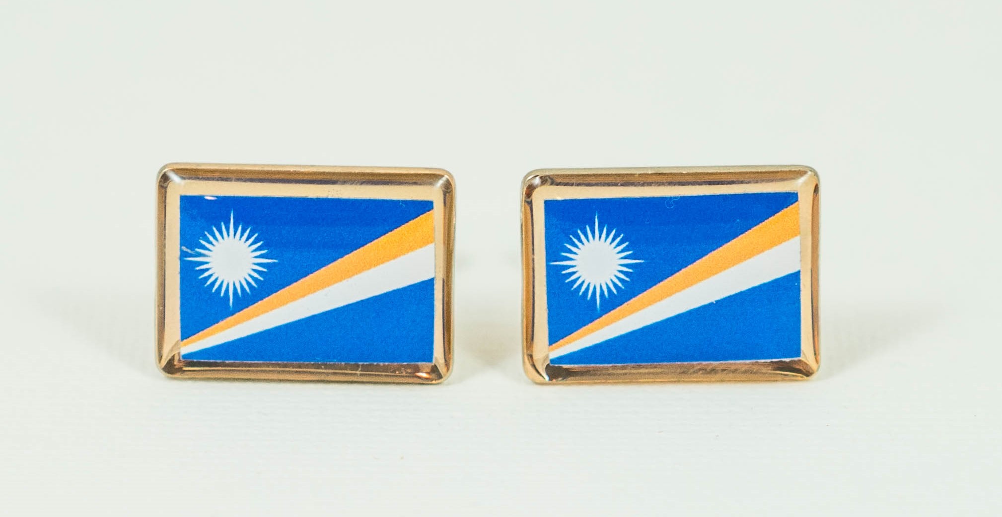 These are cufflinks of the flag of the Marshall Islands. These are great for anyone who is from the Marshall Islands, has family or friends from the Marshall Islands or just visited and fell in love with them. I made these with my own hands and hope that you enjoy them. These are great and I love to get comments on them and all my other pairs when I wear them. These are high quality. The borders are a golden metallic tone.