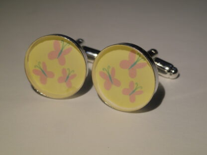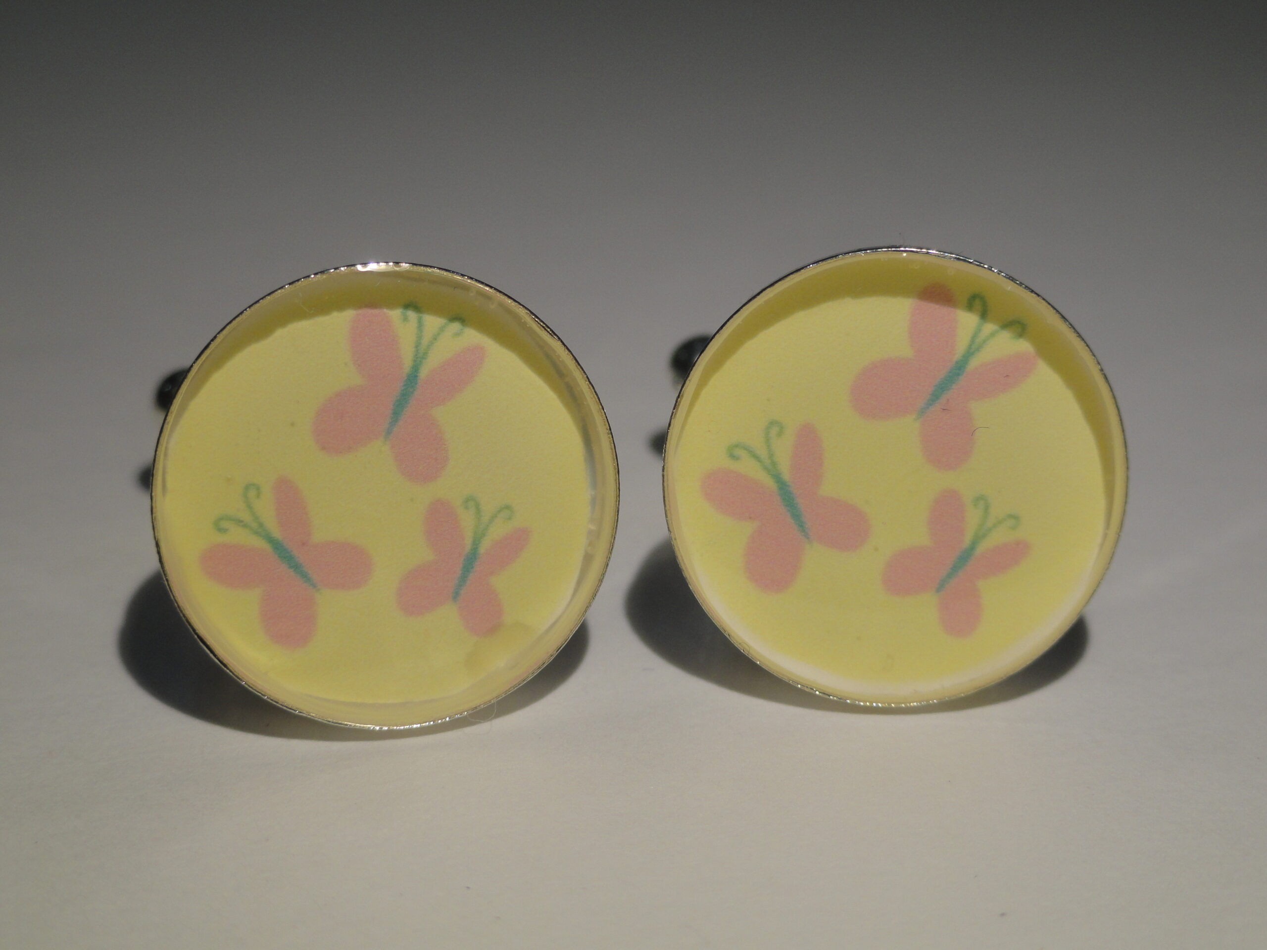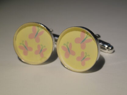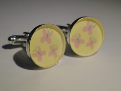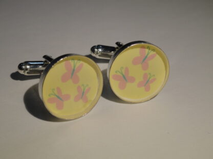Well, you guys asked for them and I finally am able to produce these with the help of a very talented craftsman. These are cufflinks for My Little Pony. They feature the cutie mark for Fluttershy. They are printed and glossed inside sterling silver frames, painted cleanly with no streaks, extremely precise detailing and crisp lines. They also have a nice gloss finish which explains the shininess in the photographs. I think that is better though, don’t you? Wouldn’t want your cutie mark to be LACK LUSTER.