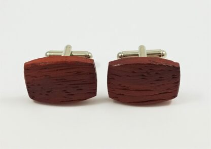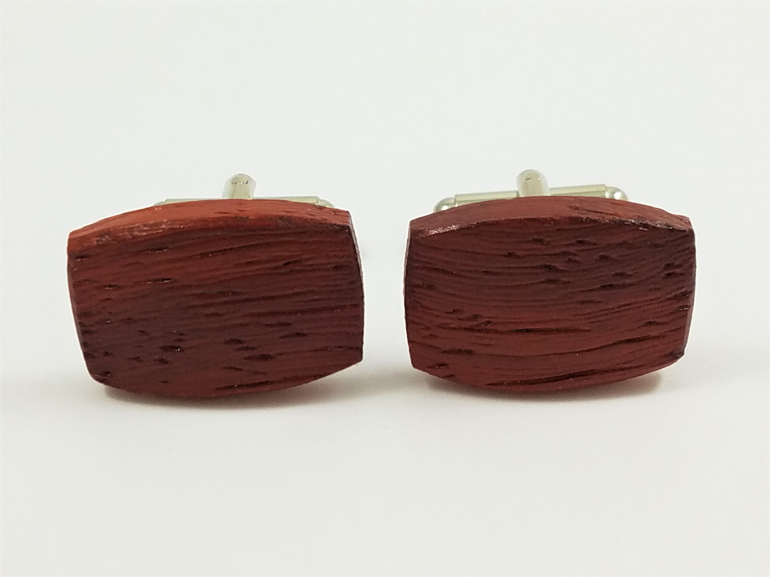 These cufflinks are made of highly polished wood from the Padauk or Petrocarpus soyauxii of Africa. The grain and features are captured very well. Padauk is a beautifully grained exotic hardwood. All of this marbling, grain and striations that you see are 100% natural. The wood naturally grows like this. This is the real color: a dense, vibrant terracotta red. I love wearing these ones because they look great without being over the top or gaudy.
