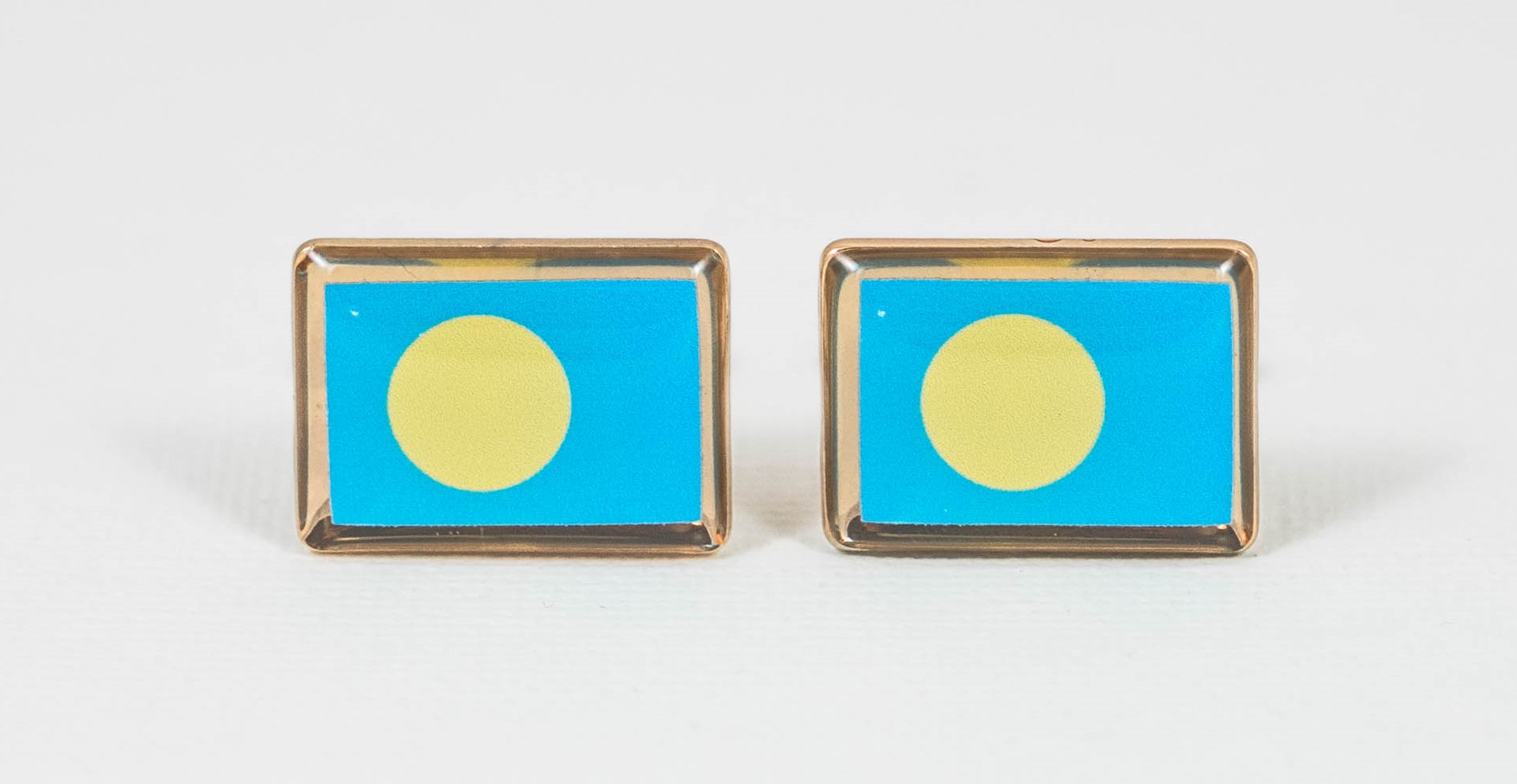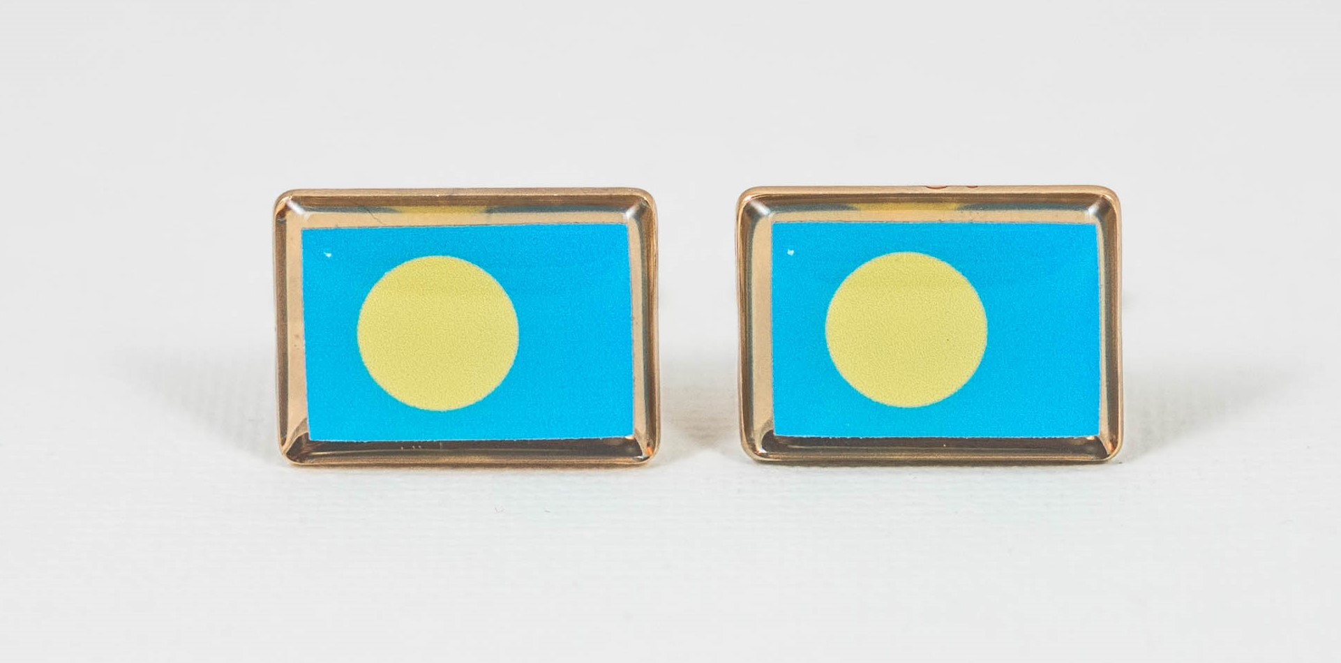 These are cufflinks of the flag of Palau. These are great for anyone who is from Palau, has family or friends from Palau or just visited and fell in love with it. I made these with my own hands and hope that you enjoy them. These are great and I love to get comments on them and all my other pairs when I wear them. These are high quality. The borders are a golden metallic tone.