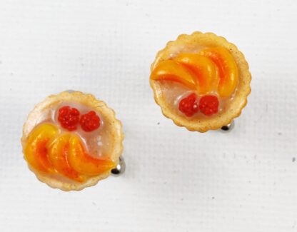 Wow! Don’t you just love these? A great pair for you or for some guy that loves fruit tarts or delicious desserts. Feature a cookie crust with peaches and raspberries. Made out of polymer clay to look at realistic as possible.
