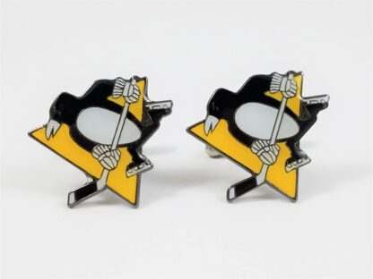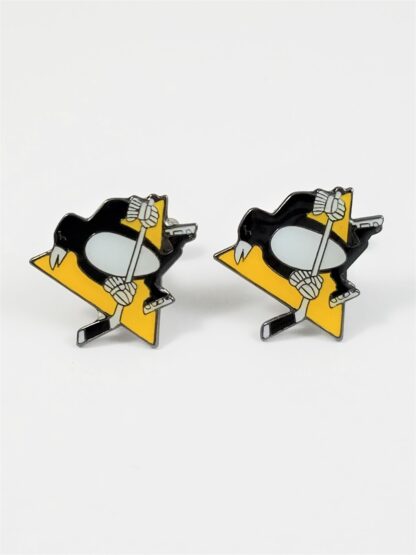 These are cufflinks made for the Pittsburgh Penguins, one of the best hockey teams right now in the NHL and serious Stanley Cup contenders. Show your pride for hockey and your team by purchasing this extremely high quality set. The logo is done is enamel with a glossy finish. Superb detail and superb price. Shows the Penguin skating with vigor.