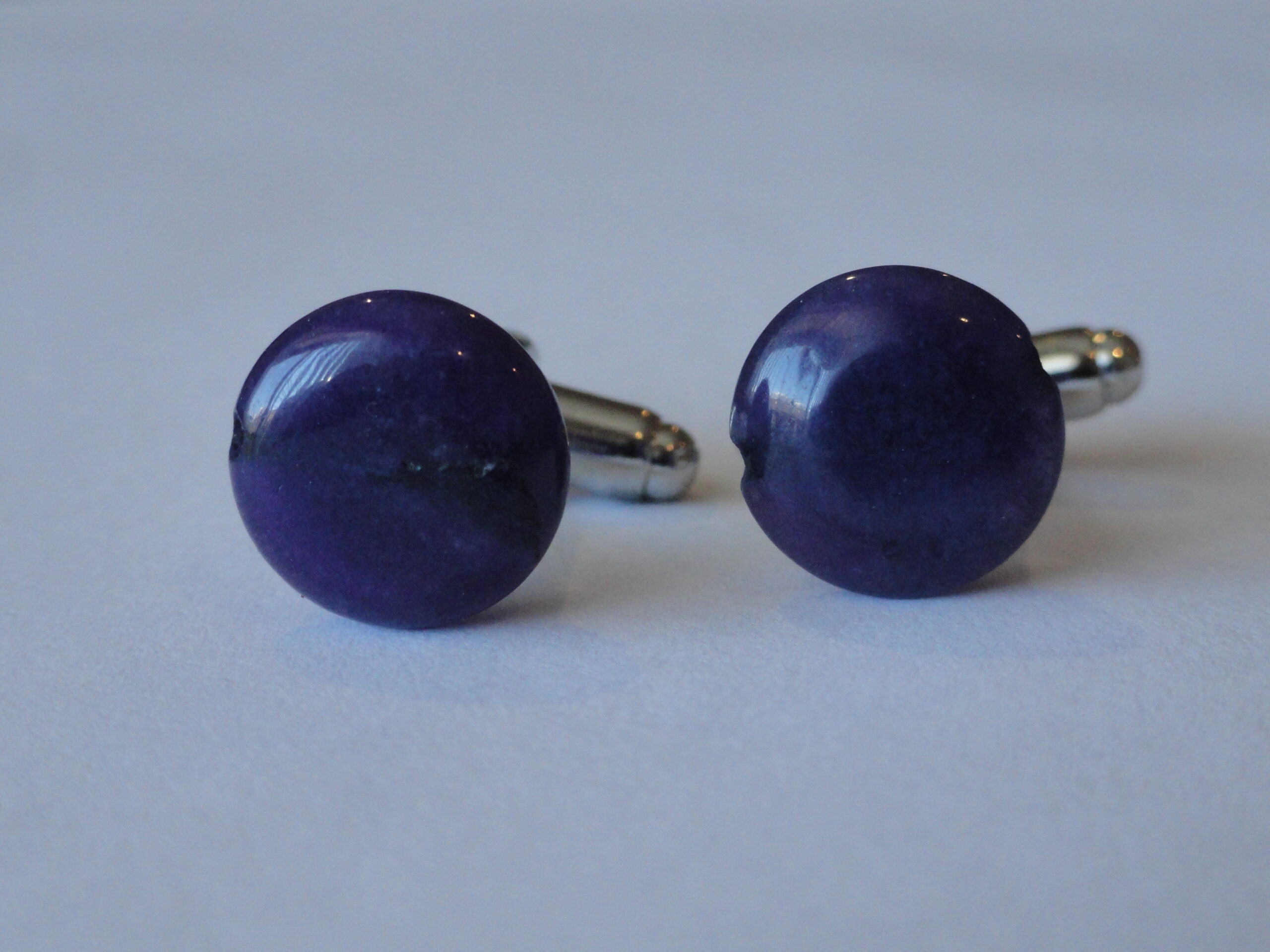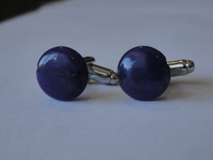 These are cufflinks I made from circular, highly polished purple stone. The pattern of the stone is very interesting and organic. I really like these ones. They are gorgeous, so they look good in formal settings or in non-formal without being too gaudy.