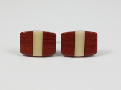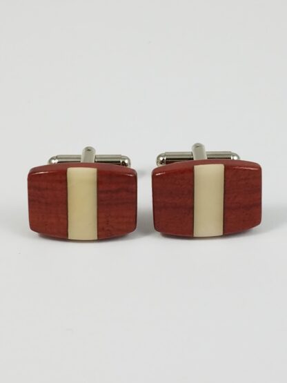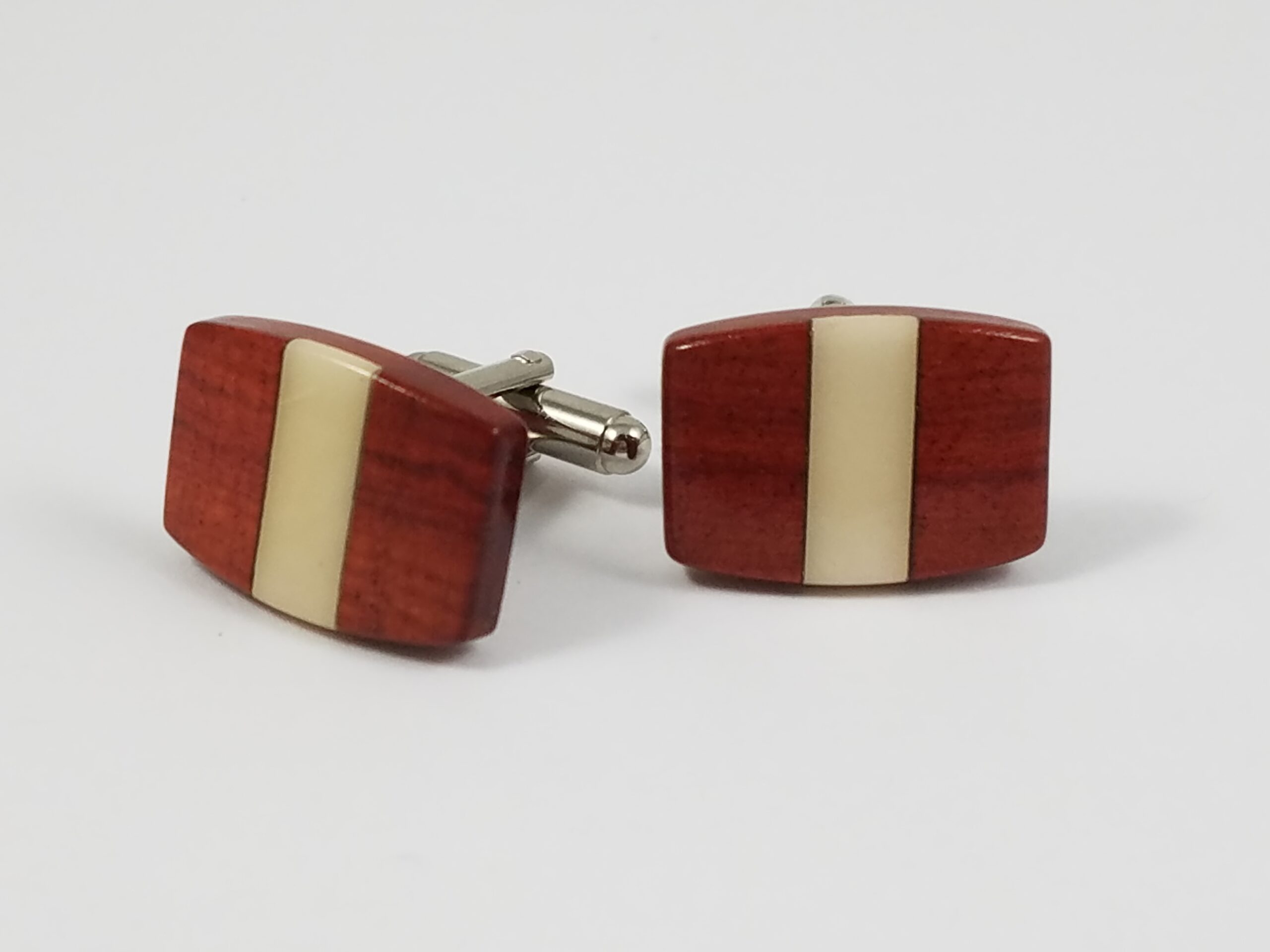These cufflinks are made of highly polished wood from redheart wood from Central and South America. The grain and features are captured very well. Redheart is a beautifully fine-grained exotic hardwood. All of this marbling, grain and striations that you see are 100% natural. I have used no stains. I love wearing these ones because they look great without being over the top or gaudy.