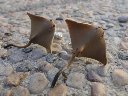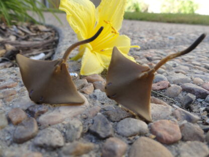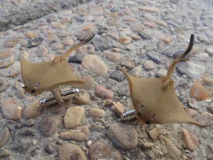 These are a pair of cufflinks made from little sting rays. They are painted the same earth tone tan that real sting rays are. Detailing is quite good: you can see eyes, gill slits, a mouth (on the underside) and the black barb of the tail.