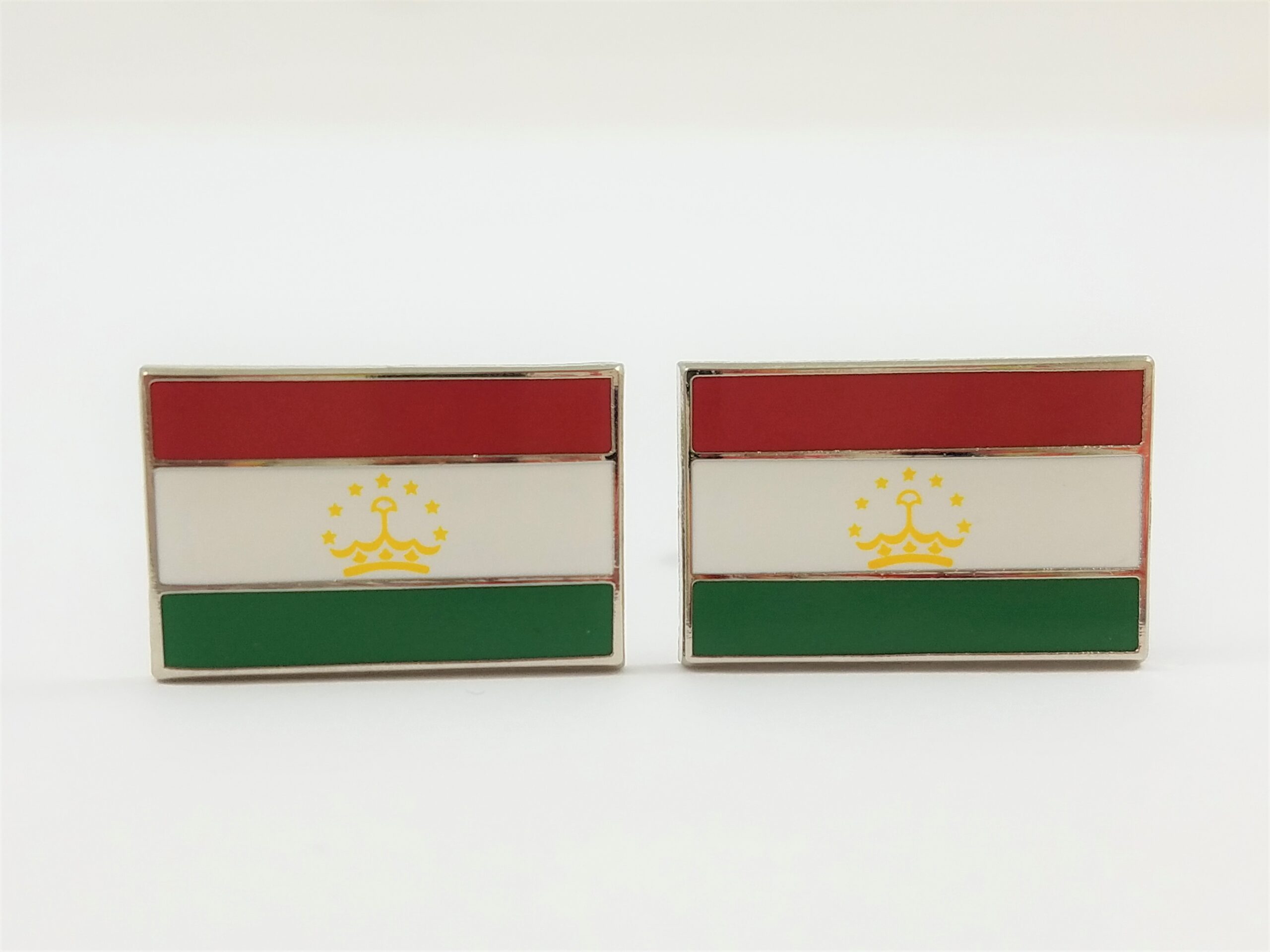These are cufflinks of the flag of Tajikistan. These are great for anyone who is from Tajikistan, has family or friends from Tajikistan, or just plain loves them some Tajikistan. I made these with my own hands and hope that you enjoy them. These are great and I love to get comments on them and all my other pairs when I wear them. These are made out of enameled steel and are high quality.