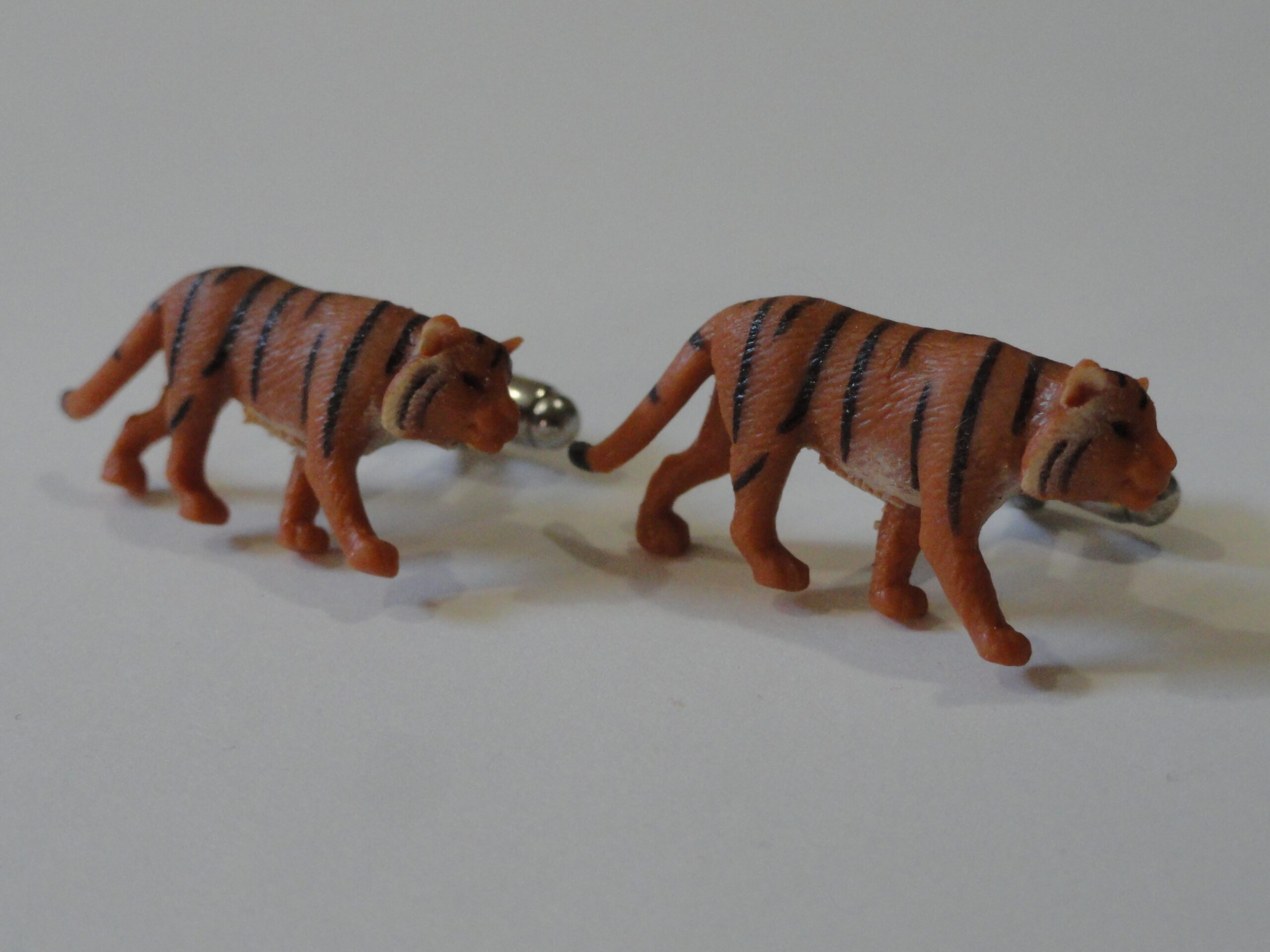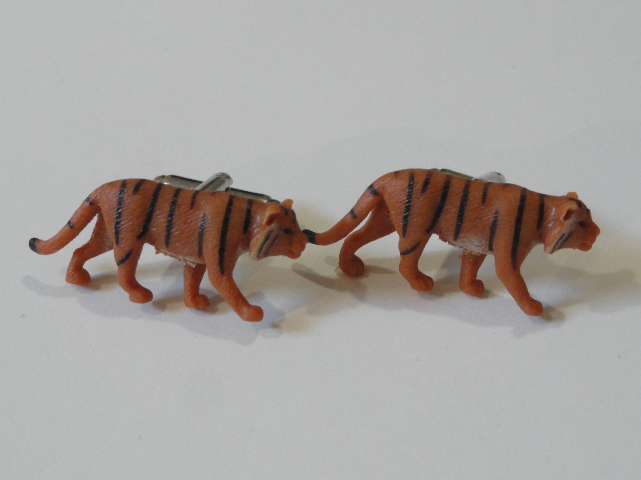 Tiger cufflinks, perfect for anyone who has been to China, India, Southeast Asia or Siberia, gone on a safari, has visited Asia, or just loves to see these big cats at the zoo! The body is perfectly proportioned, with the black and orange stripes and details well-defined as you can see, and the shading is accurate. It looks like tiger fur. I think the detailing on this pair of mine is excellent as you can clearly see all the lines, feet, eyes, ears, etc.