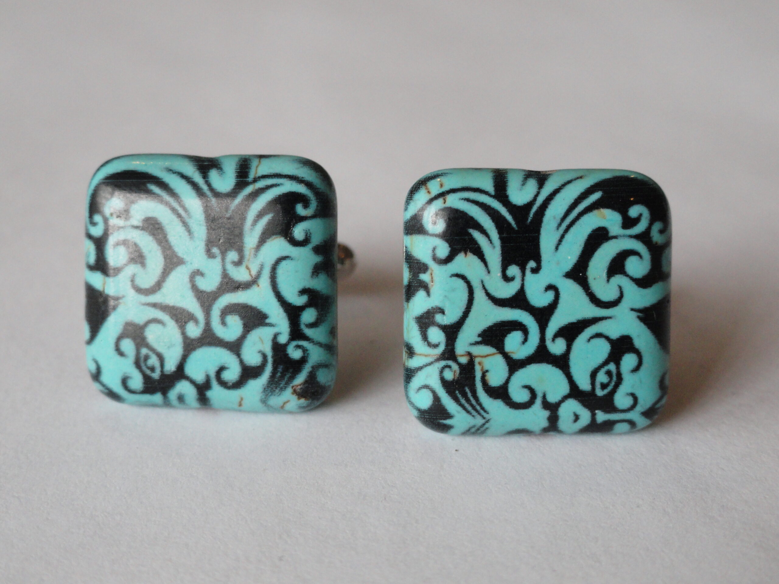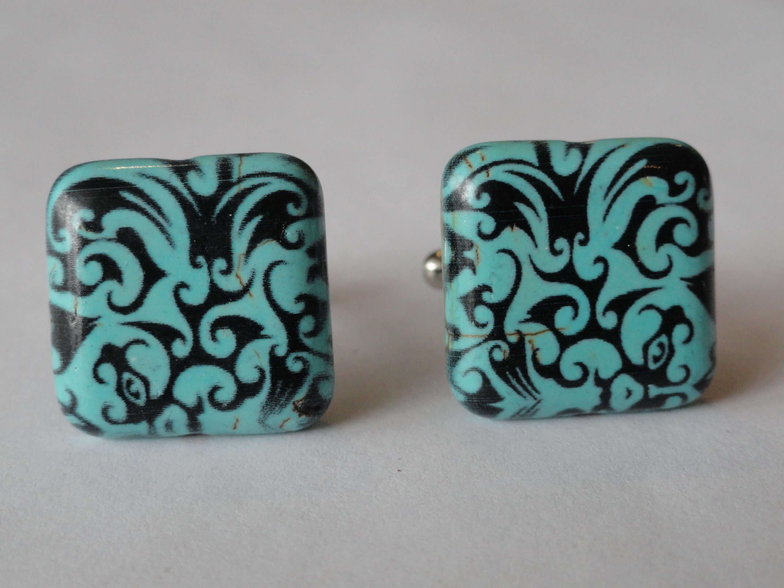 These remind me of turquoise tiles. They have a beautiful turquoise color with black, organic patterns that conjure images of plants. These look great in formal and non-formal settings. Perfect size of about 3/4 of an inch square. Great for any guys that like Art Nouveau, organic lines, plants, abstract or are just looking for a more unique style.