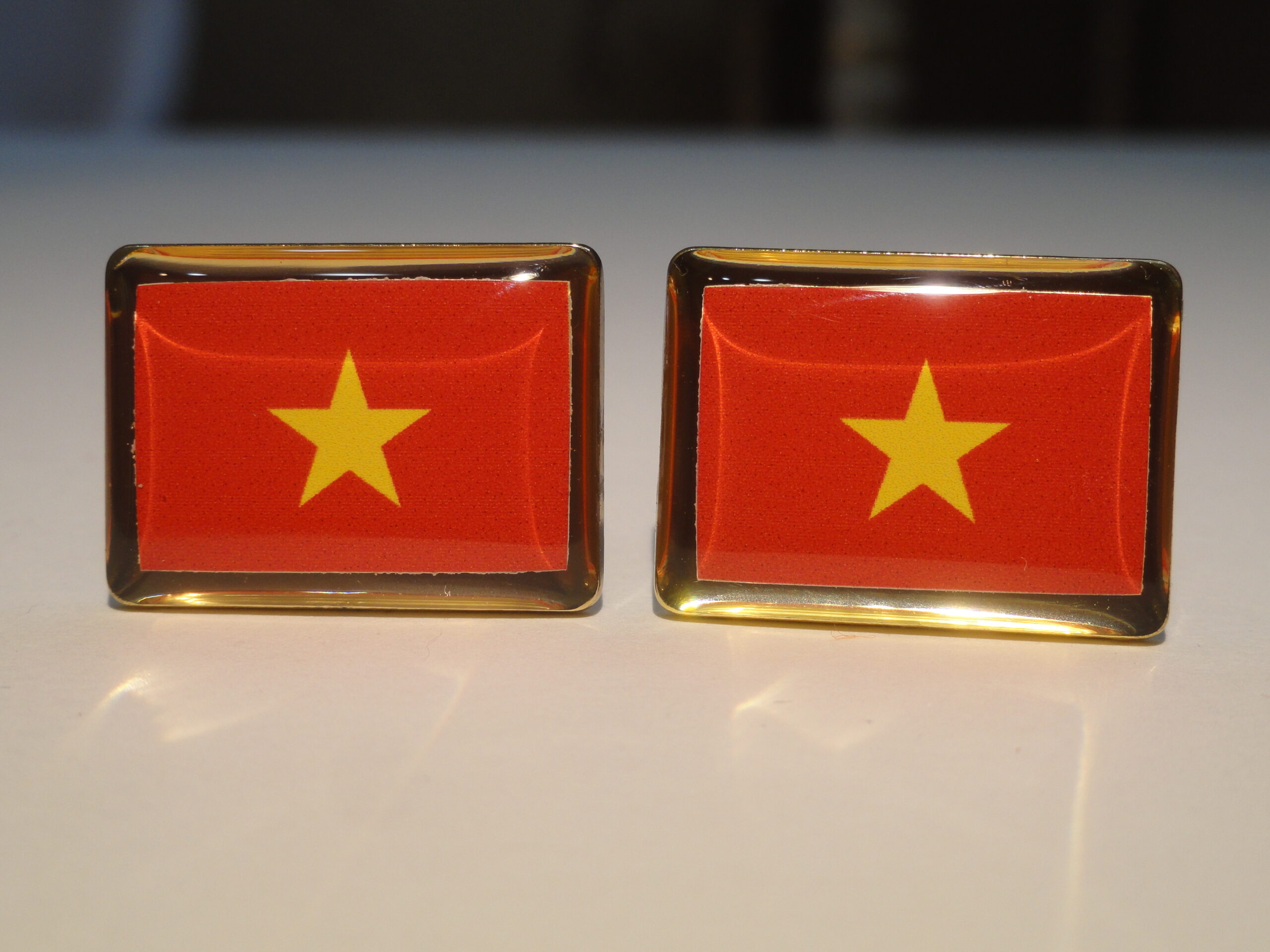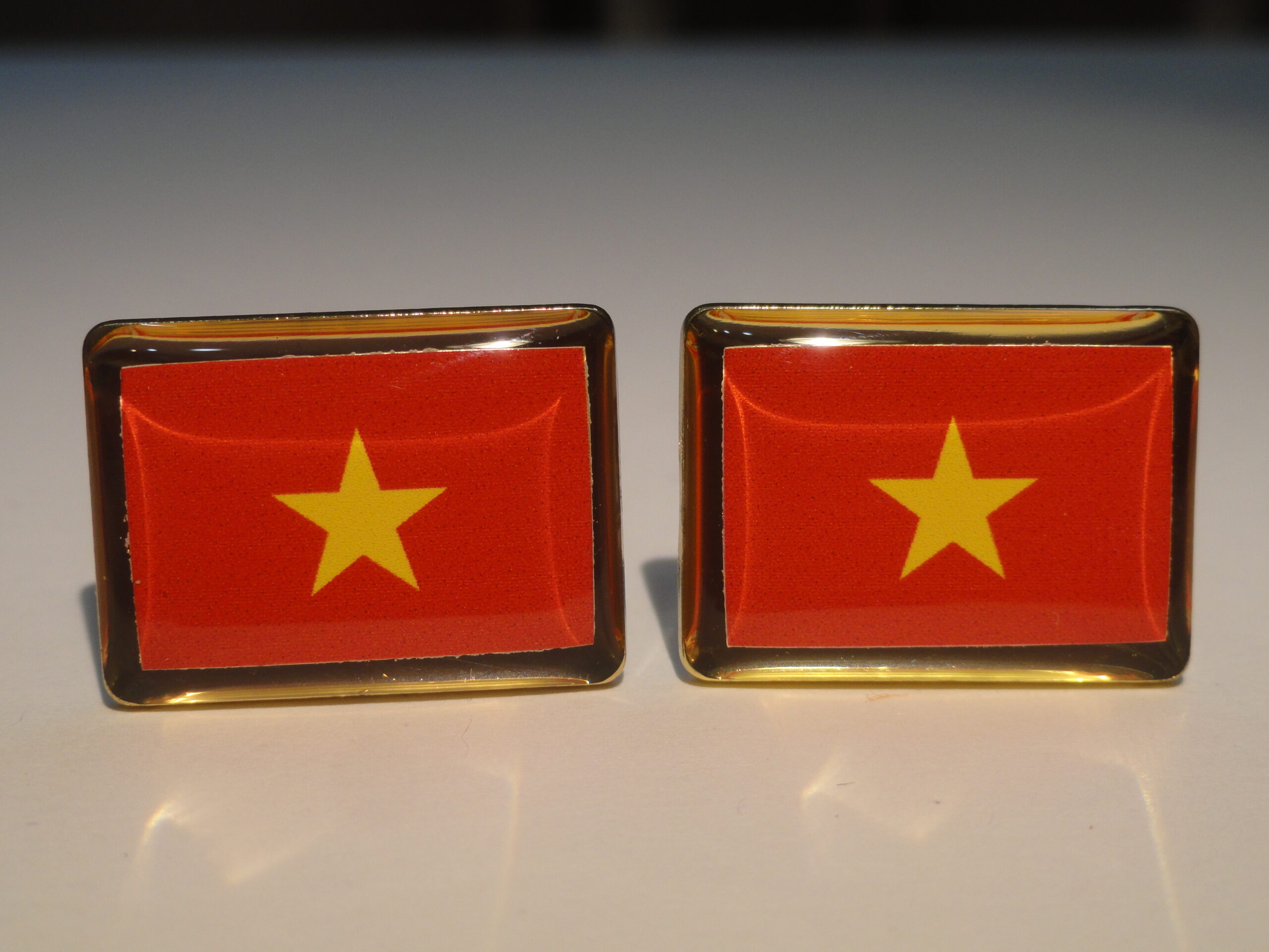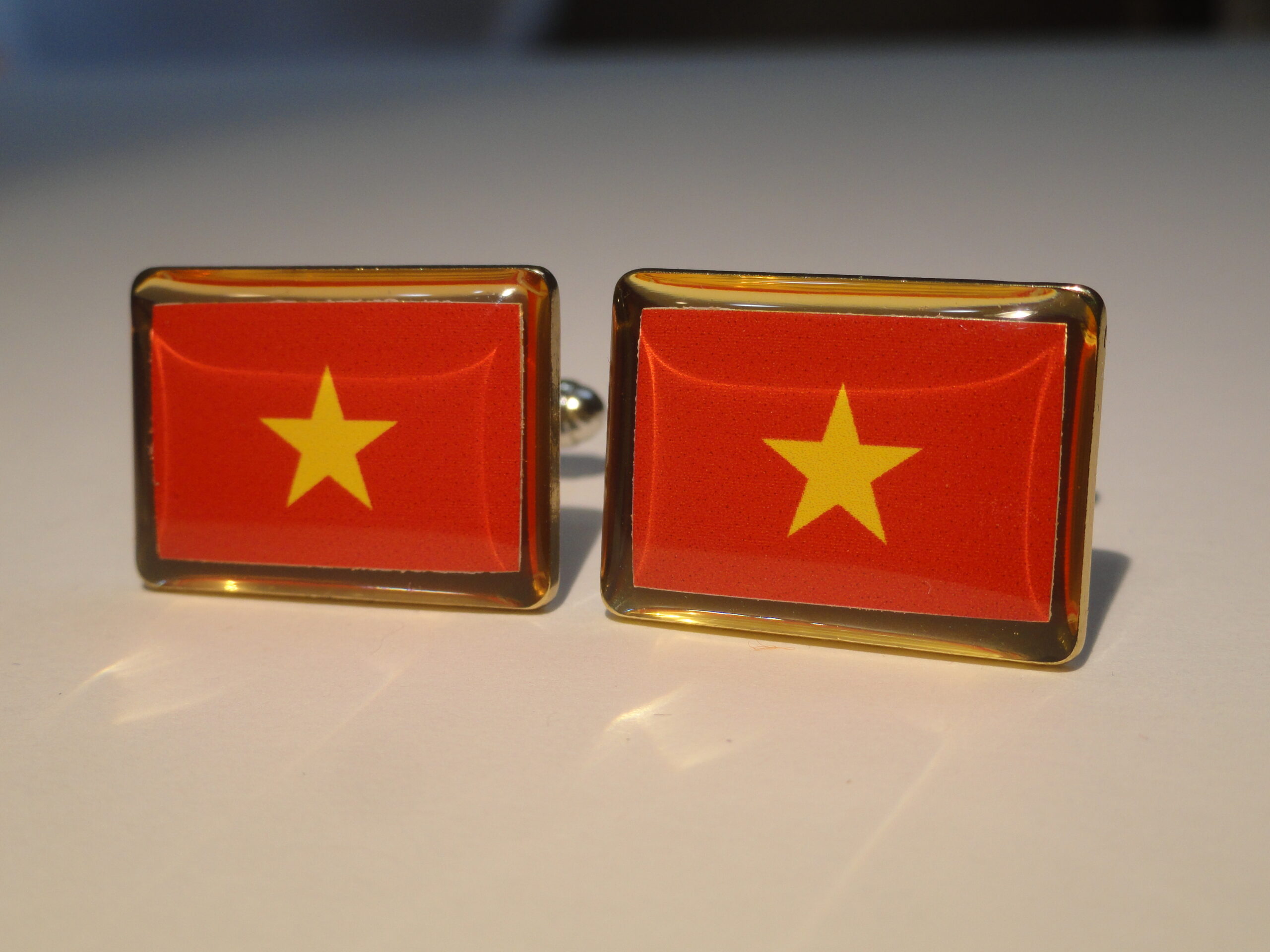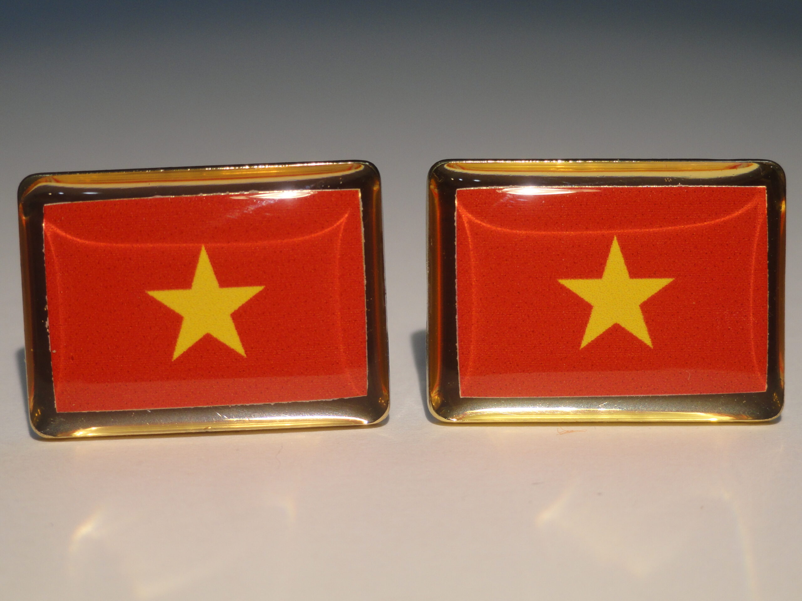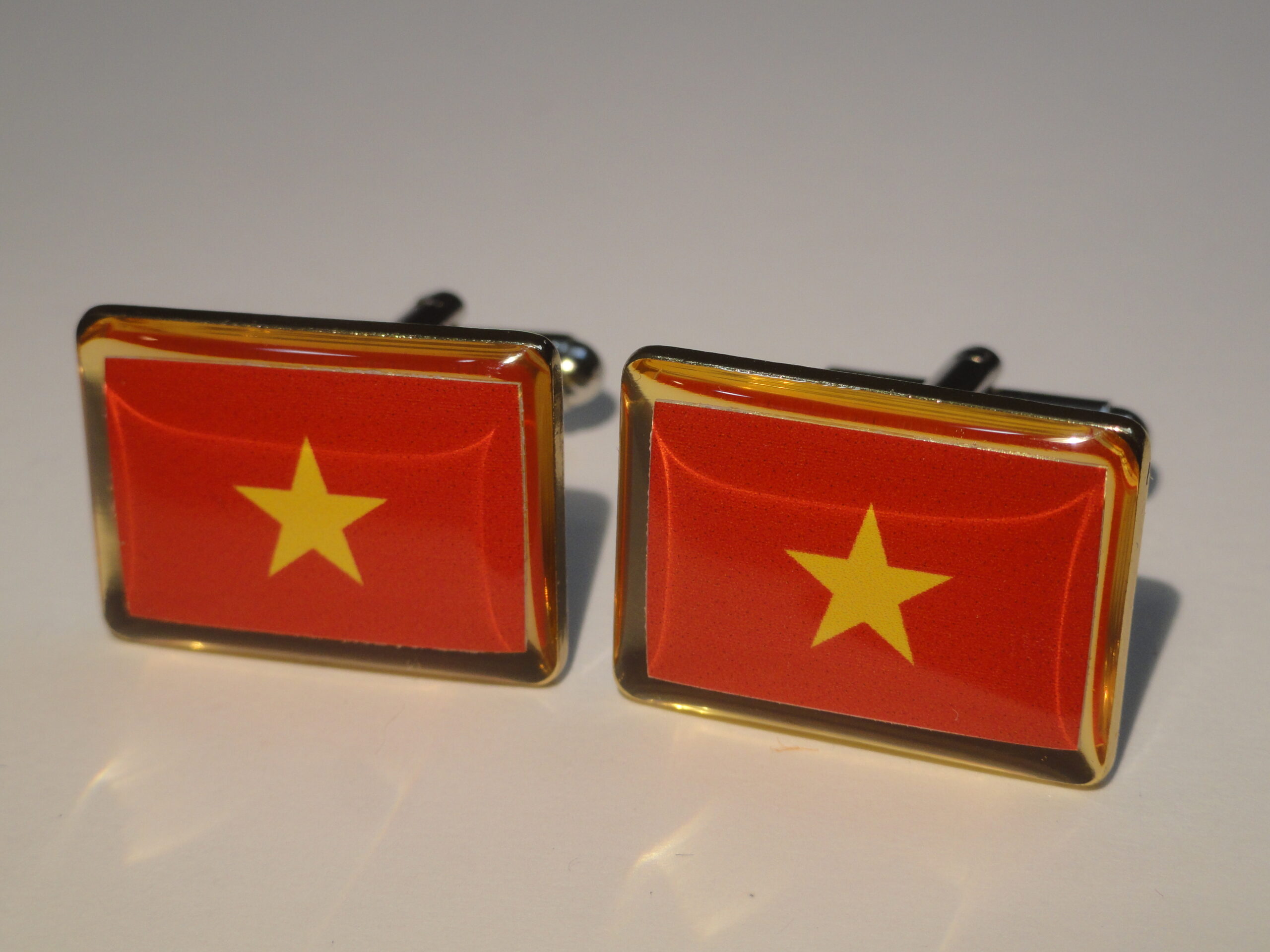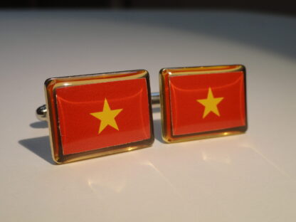 Cuff links of the flag of Vietnam. Do you love Vietnam? Maybe you just like the simple geometry and colors of this flag? This might be the pair for you. It’s simple field of red and gold star in the middle, if not for flag purposes, are aesthetically pleasing all by themselves. Show your Vietnamese pride all day long.
